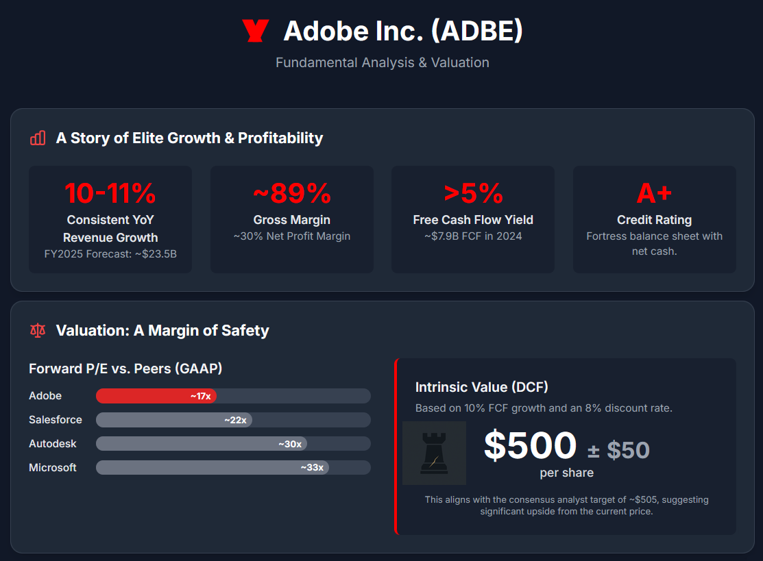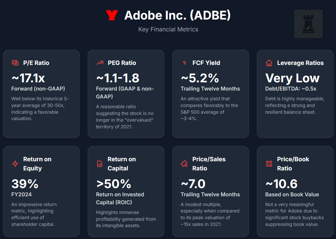 In summary, Adobe’s fundamentals show a high-quality business with consistent growth, wide margins, and excellent cash flows. Its valuation multiples have come down significantly from peak levels, now appearing reasonable relative to its growth and profitability. However, the stock is not a “deep bargain” on an absolute basis – one is still paying ~21x forward earnings, so the investment case hinges on sustained growth and moat durability.