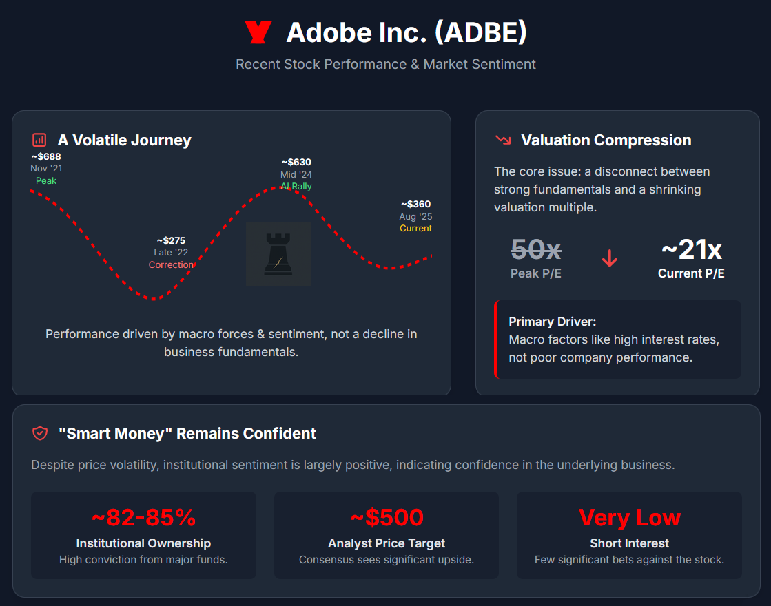 As of August 2025, Adobe is trading around $350-360. This current weakness is primarily attributed to a isconnect between the company's strong (and even improving) fundamentals and its stock valuation. The stock's forward P/E ratio has compressed from nearly 50x at its 2024 peak to a more moderate ~21x, a shift driven by macro factors rather than business performance. These include persistently high interest rates, widespread investor profit-taking after the AI rally, and sector-wide ETF outflows that created selling pressure. While factors like economic growth can affect Adobe's corporate revenue, the company has managed inflation well and currency fluctuations have been a minor headwind. The largest macro impact has been from interest rates, which have compressed the stock's valuation multiple rather than harming its actual operations.