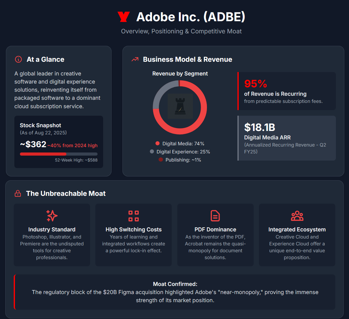 Adobe Inc. (NASDAQ: ADBE) is a global leader in creative software and digital experience solutions, known for flagship products like Photoshop, Illustrator, Acrobat PDF, Lightroom,… and the Experience Cloud. Founded in the 1980s, Adobe has reinvented itself multiple times (from packaged software to subscription-based cloud offerings) and today enjoys a wide economic moat in the creative industry. In recent times, however, Adobe’s stock has plummeted ~40% from its 2024 highs amid broader tech market volatility and investor profit-taking. As of August 21, 2025, Adobe’s share price hovers around $353, down from a 52-week high of ~$588 in September 2024. This report provides a deep fundamental analysis of Adobe from a value and growth perspective focusing on business quality, financial fundamentals, valuation, and future outlook.