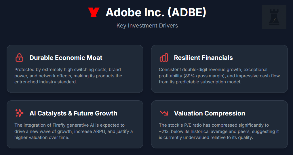 Durable Economic Moat. Adobe’s dominant market position in creative and document software is protected by extremely high switching costs, brand power, and network effects, making its products the entrenched industry standard.