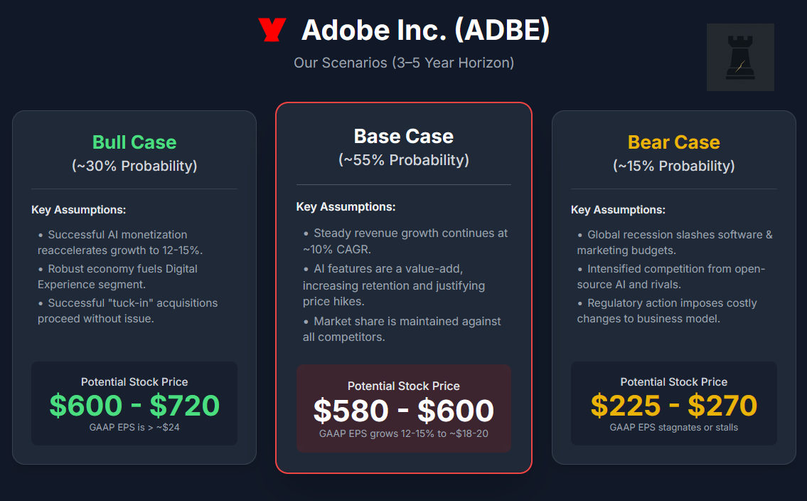 Given Adobe’s current situation, we outline three possible scenarios for the company’s performance and stock price over a 3-5 year horizon, with estimated probabilities and the conditions required for each scenario: