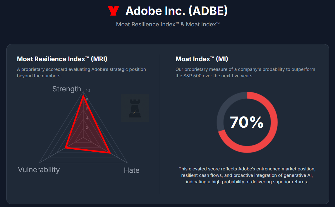 Our proprietary qualitative "MRI" scorecard evaluates Adobe’s strategic position beyond the financial numbers. The MRI framework refers to evaluating a company’s Moat (sustainable competitive advantage), the degree of Hate or pessimism the stock faces (contrarian opportunity), and its Vulnerability (exposure to factors that could erode the moat or performance).