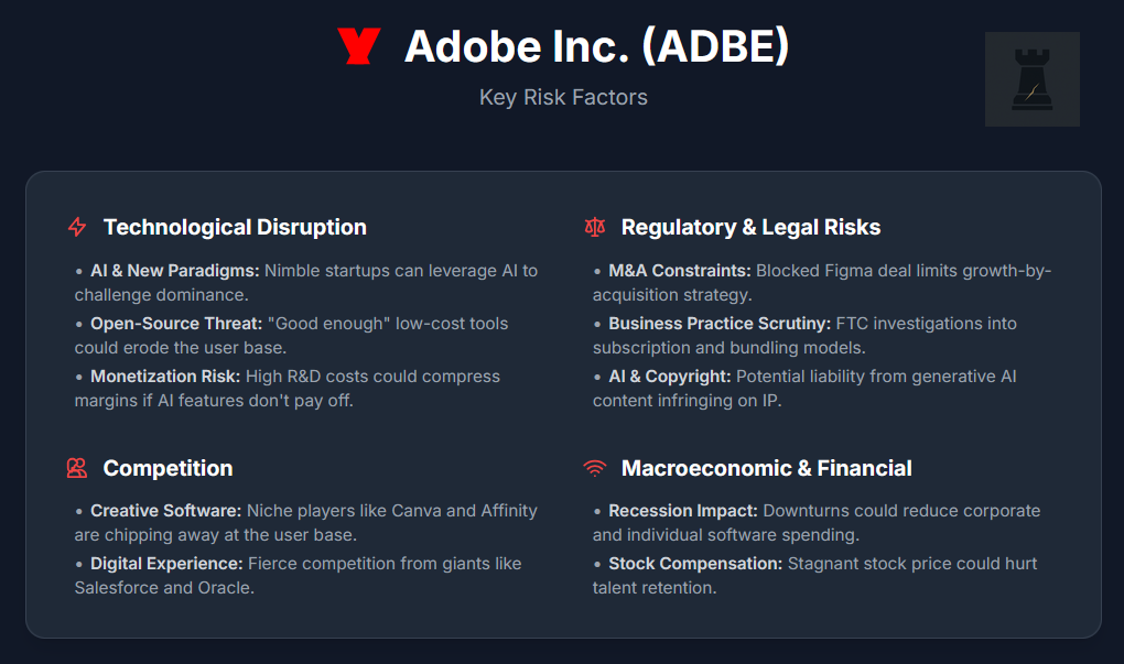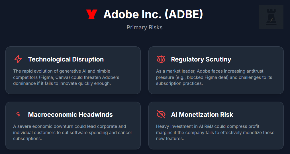 In summary, while Adobe has a formidable market position, its path forward is not without challenges. The intersecting risks of rapid technological change from AI and increased regulatory pressure represent the most critical factors for investors to monitor.