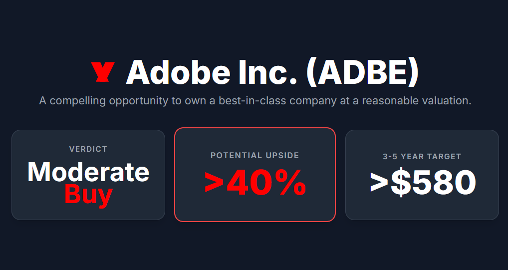 MODERATE BUY. At its current price, Adobe offers a compelling opportunity to own a best-in-class company with a wide moat, consistent growth, and a strong balance sheet. For investors with a long-term horizon, we believe the current lukewarm market sentiment provides a chance to accumulate a stock that has a high probability of outperforming the broader market as its fundamentals continue to compound value.