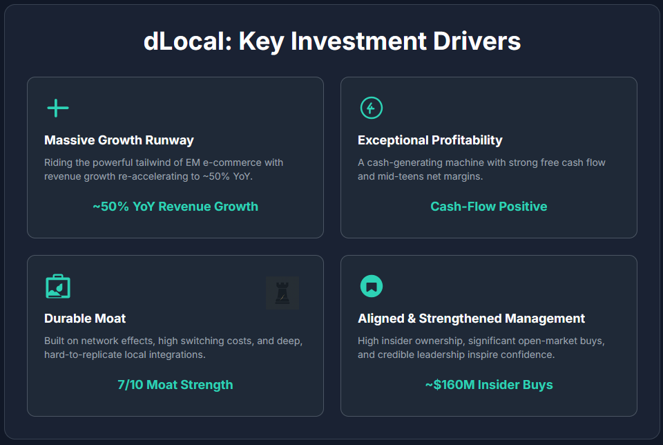 Ultimately, dLocal represents a classic contrarian opportunity. It is a high-growth, profitable enterprise navigating the turbulent but rewarding waters of emerging markets. The company has been tested by storms of skepticism and has emerged more resilient, with stronger governance and a clearer path forward. The ride will not be smooth, but for patient investors, we believe the disconnect between the market's lingering fear, the ‘hated moat’, and the company's fundamental strength presents a compelling journey towards significant long-term value creation.