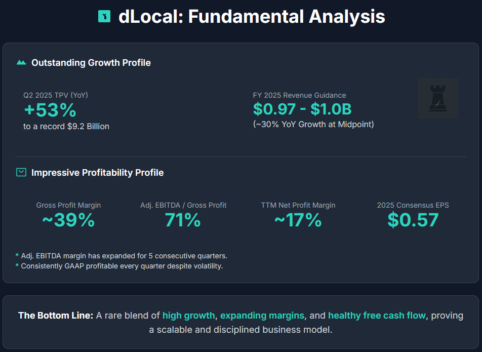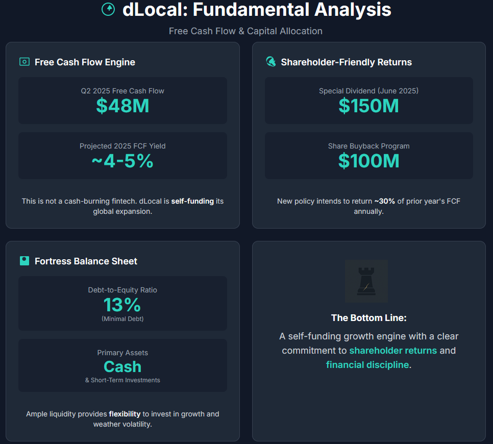 Exceptional Profitability. Unlike many cash-burning fintechs, dLocal is a cash-generating machine with mid-teens net margins, strong free cash flow, and a solid balance sheet.