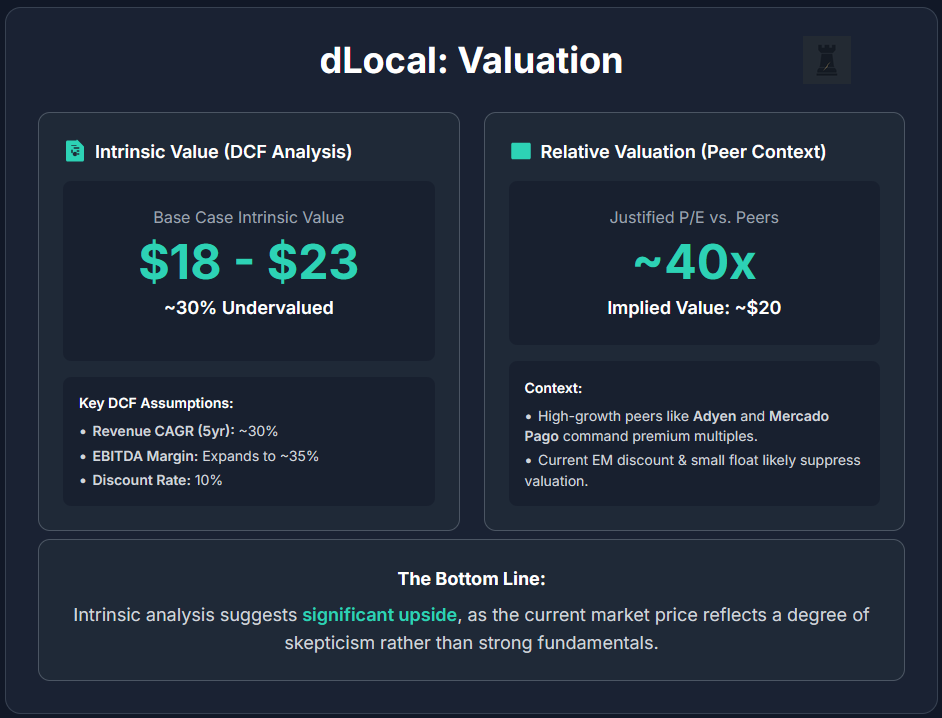 If dLocal was valued at multiples similar to high-growth payment peers, there is room for expansion. For instance, Adyen (after its recent crash) trades around 10x sales for mid-20s growth. MercadoLibre’s payments segment (Mercado Pago) is embedded in MELI’s valuation at high multiples due to its growth. If dLocal continues executing, one could argue for a P/E in the 40s given 30%+ growth and 20%+ ROE – which would put the stock around $20 (40x $0.50 EPS). Blended analyst models that factor in a bit of DCF and a bit of multiple comparisons seem to land in the high-teens as a fair value. It’s also worth noting that the small float and emerging-market discount have likely kept valuation in check. Should dLocal prove its resilience and perhaps seek a U.S. domestic listing or larger float over time, that discount could narrow.
