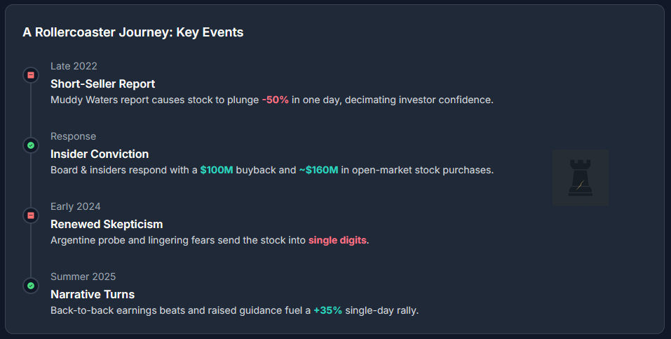 There’s no other way to put it but plainly - volatility has been extreme. DLocal’s Nasdaq-listed shares have seesawed in response to both fundamentals and controversy. In late 2022, when the stock was already down over 60% from its all-time-highs, it plunged over 50% in one day after short-seller Muddy Waters published a report accusing dLocal of being “likely a fraud” and questioning its growth and handling of client funds. This collapse (to around ~$10 from the high teens/low 20s) decimated investor confidence. In response, dLocal’s board and major investors took bold steps. They announced a $100 million share buyback and insiders (including General Atlantic and the co-founders) buying ~$160 million of stock on the open market to show conviction. These actions, along with dLocal’s continual posting of strong growth, fueled a dramatic rebound. By August 2023, the stock surged 30%+ in one day to over $20 on news that dLocal hired respected ex-MercadoLibre executive Pedro Arnt as co-CEO, on top of posting 59% YoY revenue growth that quarter.