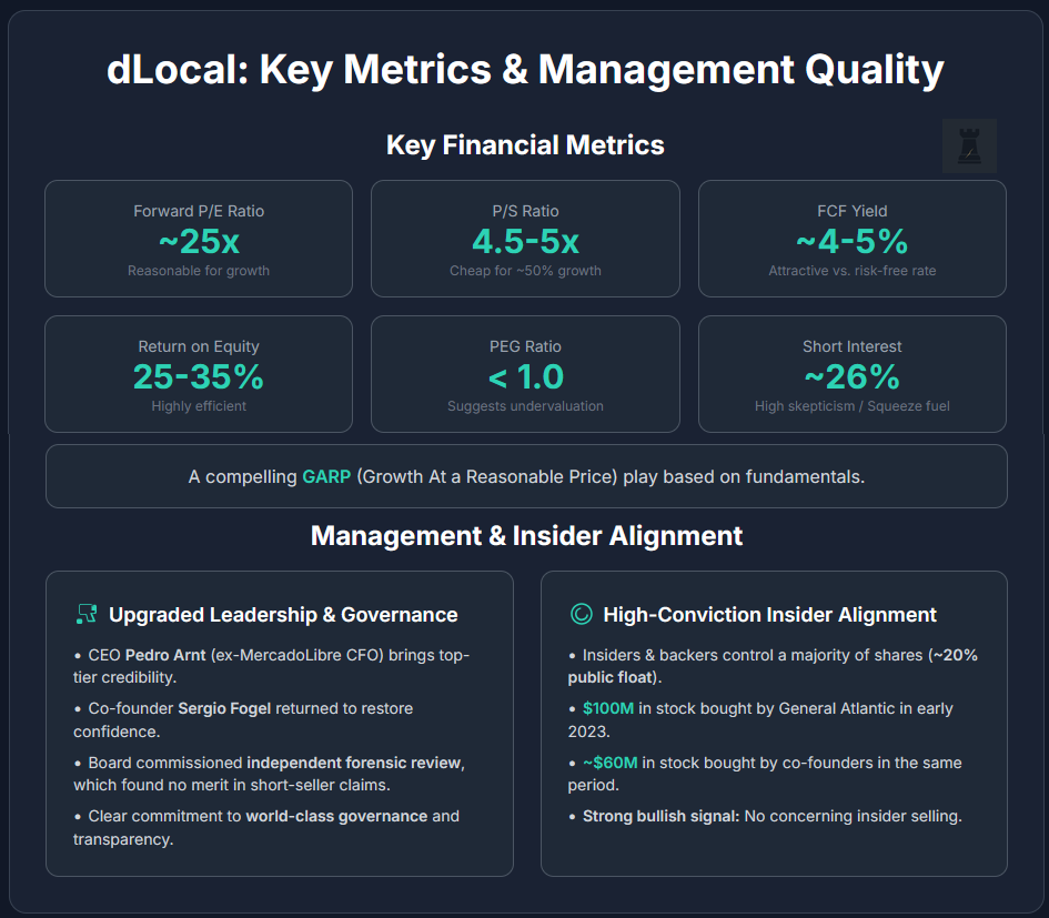However, this exuberance didn’t last too long. In late 2023 and early 2024, shares tumbled again. This time after an Argentine regulator opened a probe into dLocal (related to foreign exchange controls) and amid broader investor skepticism. The stock fell into single digits (~$7–8 by Q1 2024), reflecting lingering fears about emerging-market risks and the overhang of the short-seller allegations. Market sentiment was plainly skittish, as dLocal was an “unloved” growth stock with heavy short interest betting against it. Indeed, to this day short interest comprises ~26% of the public float, indicating that a significant group of investors remains skeptical (or is positioning for a potential short-squeeze, depending on whom you ask). Some contrarian analysts have pointed to dLocal’s combination of high growth and high short-interest as a recipe for a squeeze-driven rally - essentially, a coiled spring if the company can continue proving the naysayers wrong.