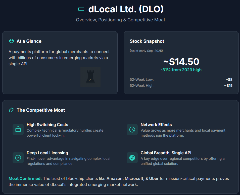 DLocal has a moderately strong moat built on network effects, one-stop integration, and hard-to-replicate local connections. The fact that global giants trust dLocal for mission-critical payment flows in emerging markets attests to its value proposition. The moat is not a 10/10 “impregnable fortress” simply because payments is an inherently replicable tech over time – well-funded competitors could develop similar networks. But dLocal’s head start and deep focus in diverse emerging markets give it a solid moat that new entrants would take years to match. The switching costs for enterprise clients (technical integration, compliance comfort) further strengthen it. We give 7/10 reflecting a durable competitive advantage, though one that requires continuous reinforcement through innovation and quality service.