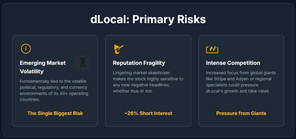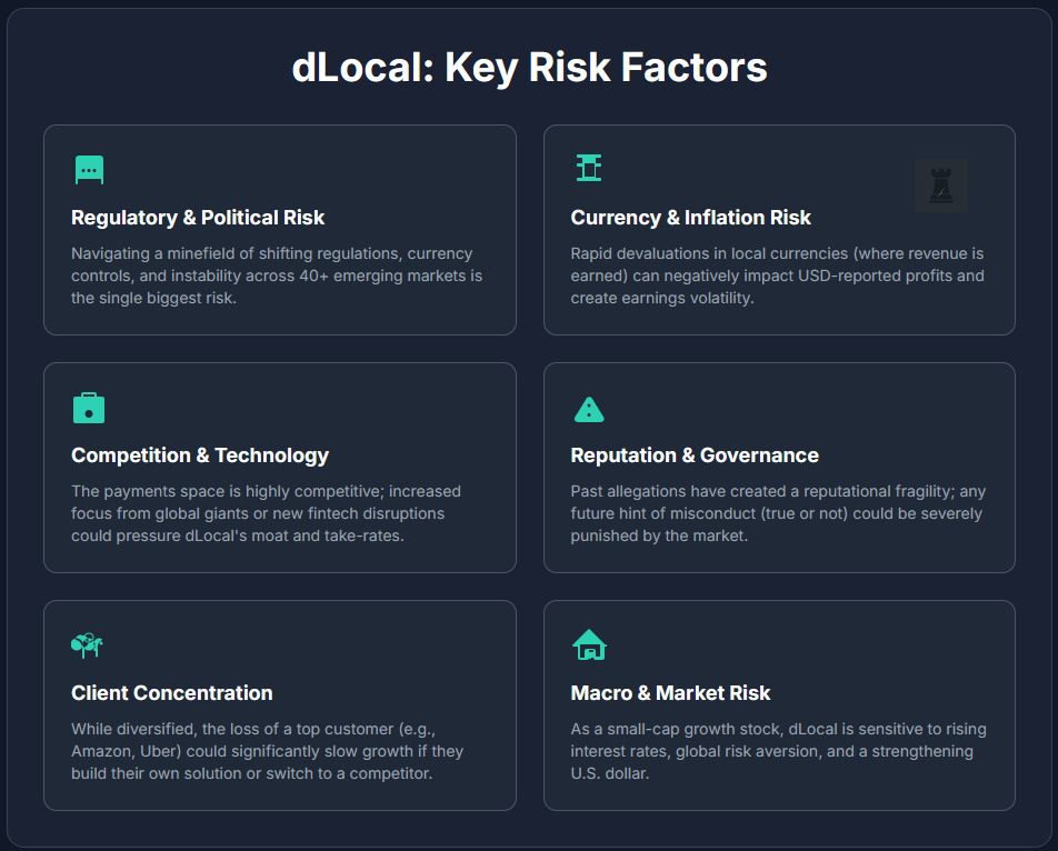 Despite its attractive growth story, dLocal faces several risk factors that investors should weigh: