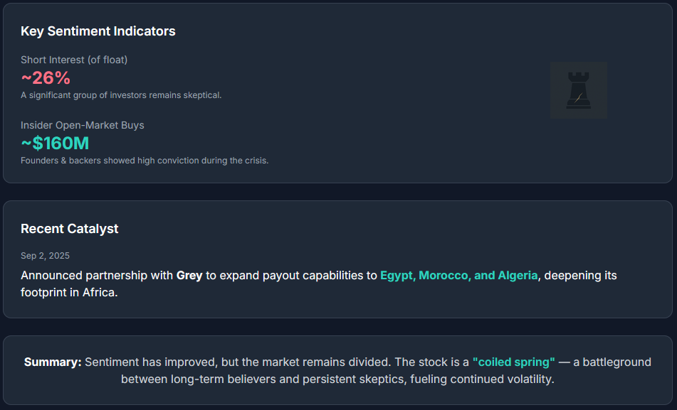 In summary, sentiment has improved from the darkest days. The market is rewarding dLocal’s execution, but caution persists. The stock’s rollercoaster over the past three years (from market darling, to embattled target, to recovering contender) means investors remain divided, with a contingent of shorts and skeptics on one side and long-term believers (including insider-owners) on the other. This dynamic could continue to fuel elevated volatility in the near term, as each new data point (earnings beat or miss, new investigation or exoneration, macro news, etc.) swings the pendulum of sentiment.