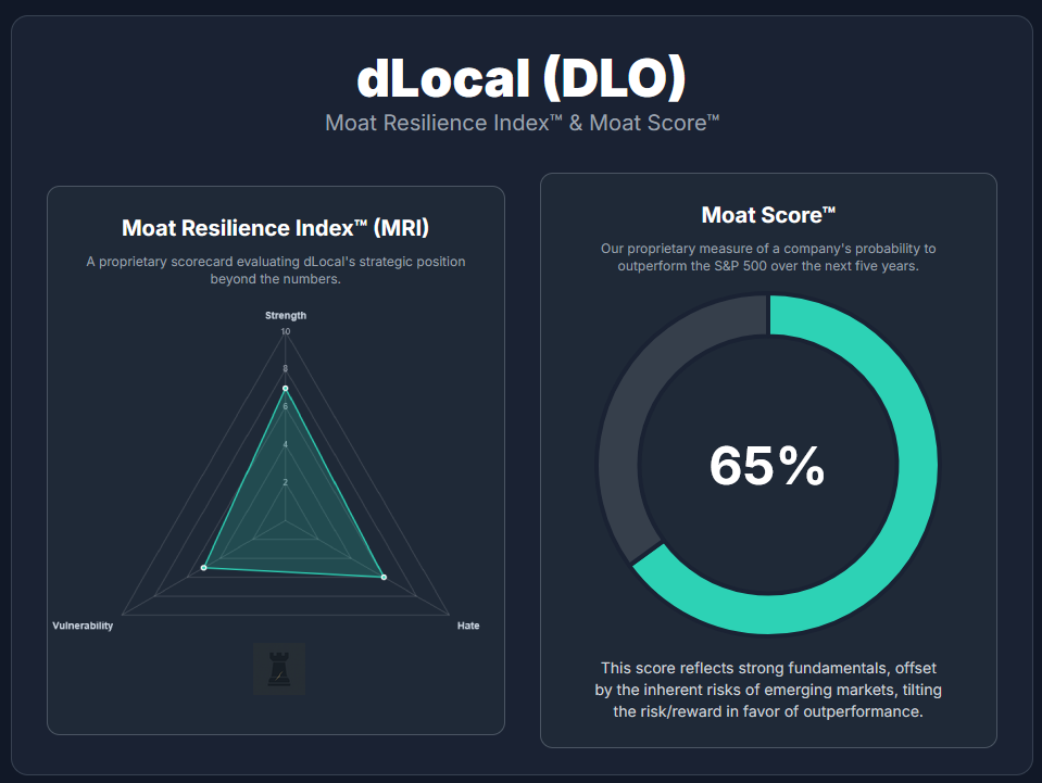 We rate dLocal on our proprietary Moat Resilience Index, examining the strength of its competitive moat, the level of external negativity (“hate”) towards it, and its vulnerability to disruption. Each category is scored 1 (worst) to 10 (best):
