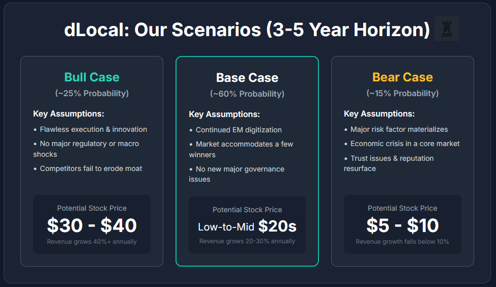 We are optimistic about dLocal’s long-term prospects. The secular trend of digital payments penetration in emerging markets is a powerful tailwind that should persist for years, and dLocal is extremely well positioned to harness that. If management continues to execute and no thesis-breaking event occurs, dLocal in 5 years could be a much larger and more mature company, potentially generating over $1.5 billion in revenue with robust cash flows. By then, we’d expect the market to either fully value its cash generation (perhaps via a combination of dividends and growth, giving both income and capital appreciation) or even consider it an acquisition target (the likes of a PayPal or a Stripe might find dLocal a compelling way to instantly gain EM reach, though, at this point, that’s speculative). In our base outlook, we see the stock appreciating at a solid clip over 3–5 years, likely outperforming broader indices.