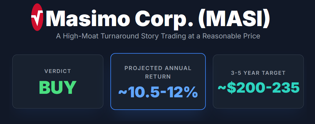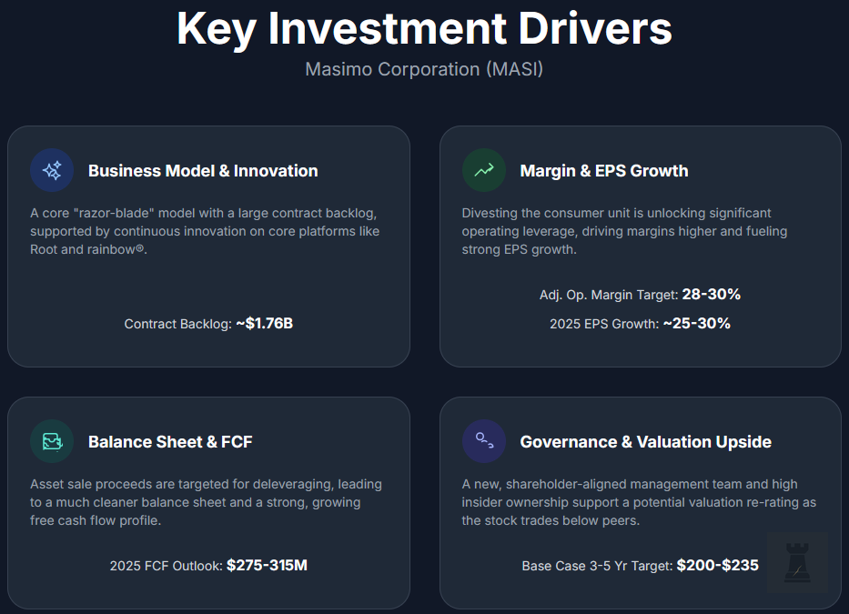 Masimo is a fundamentally strong med-tech business that stumbled and is now regaining its footing. It possesses a durable competitive moat in patient monitoring, built on proprietary technology, entrenched hospital relationships, and a recurring revenue model. The company’s financial performance is on an upswing. Core revenue is growing steadily, margins are expanding significantly, and earnings are rebounding from the one-off loss in 2024 to robust growth in 2025. With the distraction of the consumer electronics venture being eliminated, Masimo can focus 100% on what it does best - innovating and selling critical-care monitoring solutions. New management has shown it can execute and is aligned with shareholders. The balance sheet is set to improve post-divestiture, and free cash flow is healthy.