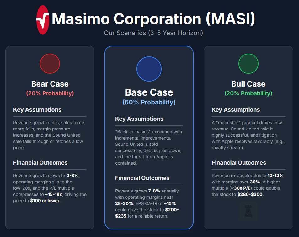 This base case is predicated on a "back-to-basics" execution story, where Masimo rebuilds investor trust by consistently delivering on its promises rather than pursuing flashy, dramatic moves. The central assumption is that growth is not driven by a single "home run" product but by incremental improvements to its existing offerings. For example, the launch of a next-gen Root platform and enhanced parameters would keep the product line competitive and encourage more frequent customer upgrades. A critical pillar of this scenario is the successful and timely sale of the Sound United division, which is expected to be completed by the end of 2025. These proceeds would be used strategically to pay down debt and increase cash reserves, strengthening the balance sheet. This outlook also depends on a stable external environment, including a healthy hospital market without major downturns in capital spending and rational competition that avoids drastic price wars. Furthermore, the threat from Apple must be contained, ensuring any reintroduction of its pulse oximetry feature does not significantly cannibalise Masimo's core hospital business. Finally, the scenario assumes management avoids new fiascos, staying on strategy and refraining from acquisitions that could spook investors.