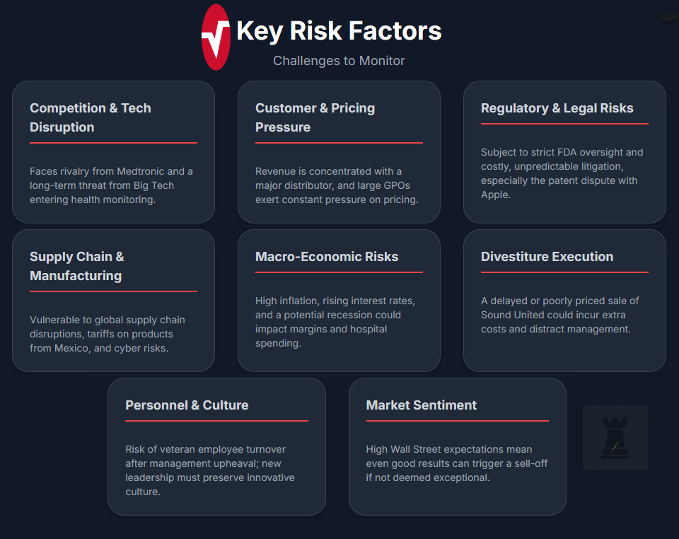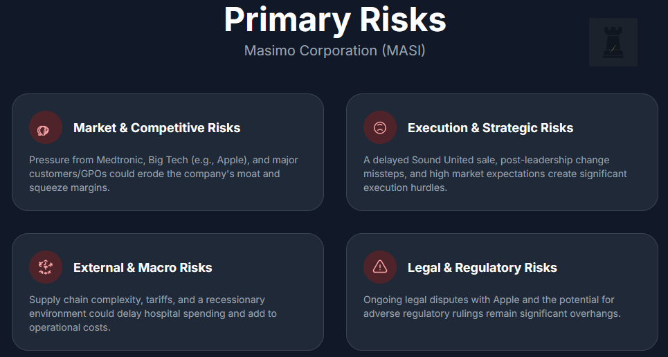 In conclusion, Masimo’s risk factors are manageable but not trivial. The stability of its core consumables business, which hospitals will continue to buy in any economy, helps mitigate downside risk. However, investors should closely monitor competitive innovations, the outcome of the Sound United divestiture, legal battles, and the consistency of the new management's execution. While Masimo's robust moat and refocused strategy position it well to handle these challenges, consistent performance is key.