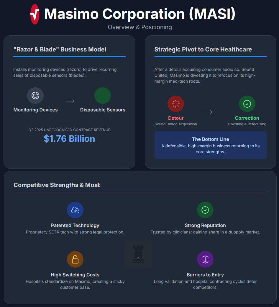Masimo is a medical technology company renowned for its "gold standard" Signal Extraction Technology (SET®) pulse oximetry used in hospitals. The company operates a highly effective "razor-and-blade" business model. It installs its monitoring devices and then generates steady, recurring revenue from the sale of disposable sensors. This has created a loyal customer base and a substantial unrecognised contract revenue backlog of approximately $1.76 billion as of Q2 2025.