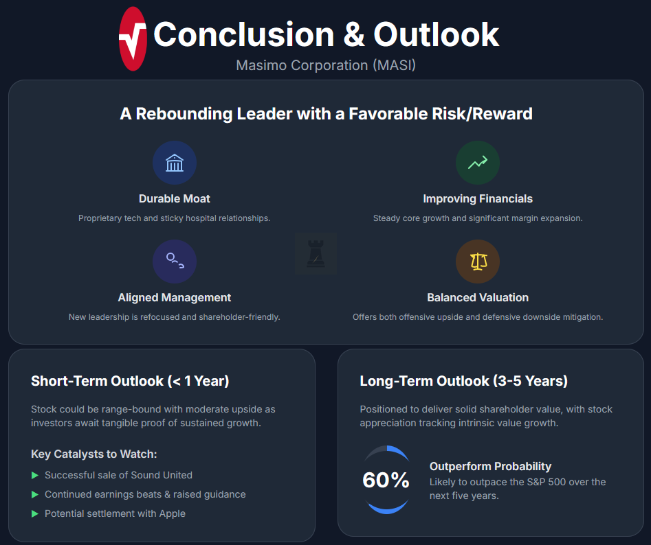 Over the longer term, we see Masimo delivering solid shareholder value. We project the stock to appreciate broadly in line with per-share intrinsic value growth (about high-single to low-double digits annually in our base case) supported by ~28–30% operating margins and steady mid- to high-single-digit core growth. With a 5-year hated-moat outperform probability of ~60%, we view Masimo as more likely than not to outpace the S&P 500 over the next five years, given its moat and improving fundamentals.