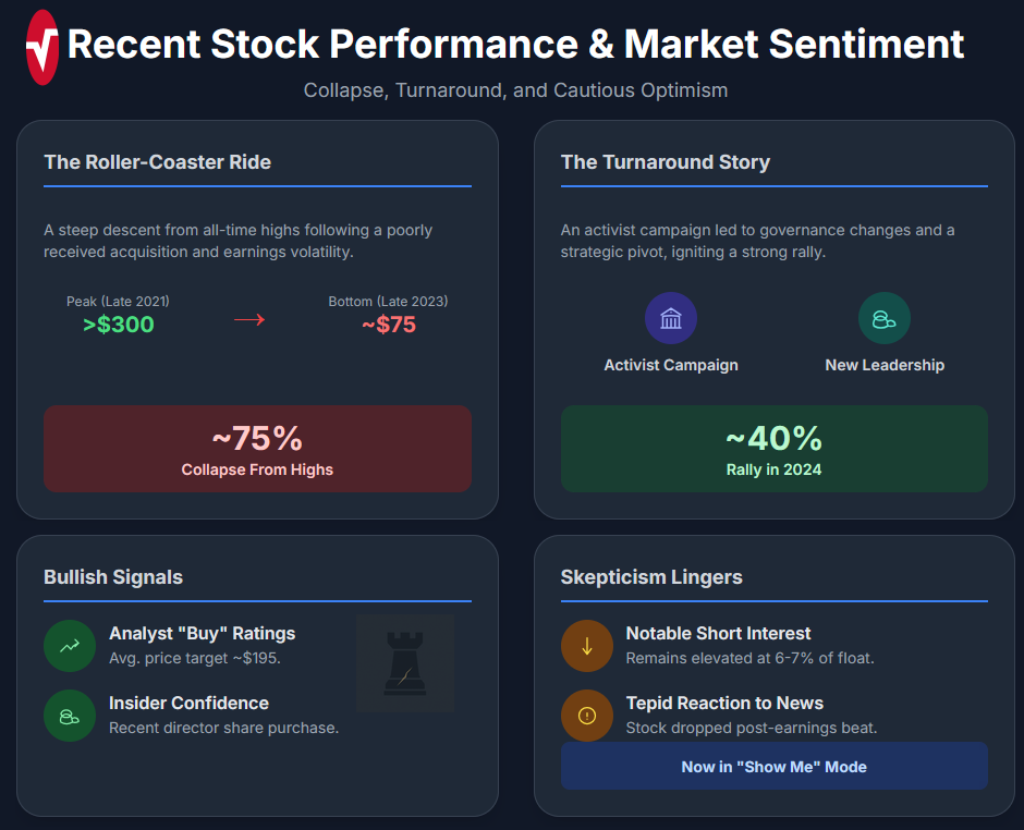 Current market sentiment is cautiously optimistic but mixed. On the bullish side, most sell-side analysts rate the stock a Buy, with an average price target around $195 and some targets as high as $210. This confidence is echoed by a recent insider share purchase by a Politan-backed director. However, skepticism lingers. Short interest remains notable at 6-7% of the float, and the stock's reaction to good news has been tepid. For instance, after a strong Q2 2025 earnings beat, the stock dropped ~12% as Wall Street expressed concern that the new strategy sounded too "incremental" and might not deliver dramatic growth.