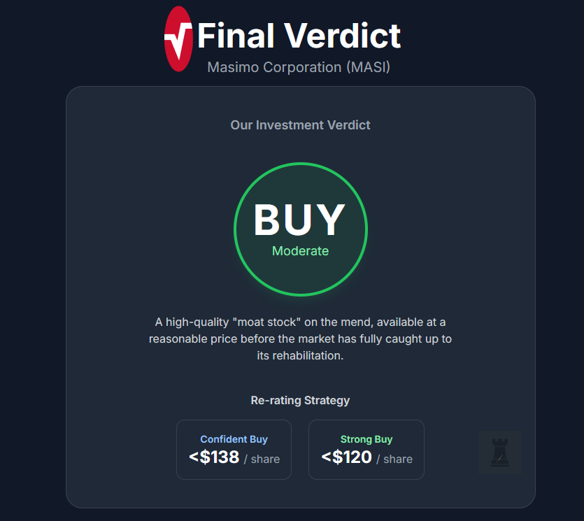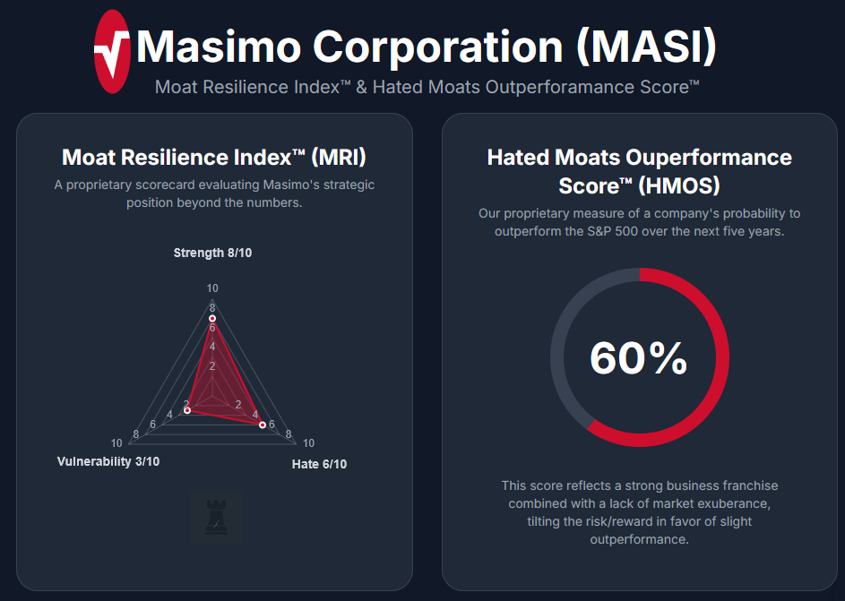 Combining the factors above, we derive our Hated Moats Score, which is the probability Masimo will outperform the S&P 500 over the next 5 years. Given Masimo’s strong moat, still-recovering market sentiment, and relatively low vulnerability, we are inclined to believe it has above-average chances to beat the market. We assign a Hated Moats Score of 60%, meaning we believe there is roughly a 60% probability Masimo’s total return will exceed that of the S&P 500 over a five-year horizon. This is a favourable odds in our framework. While we have confidence in Masimo’s moat-driven recovery, we also acknowledge that it’s a mid-cap single-product-line company in a competitive landscape. It’s not immune to hiccups, and broader market conditions could influence outcomes. So we stop short of an overwhelmingly bullish probability. Still, with 60%, we lean positively.