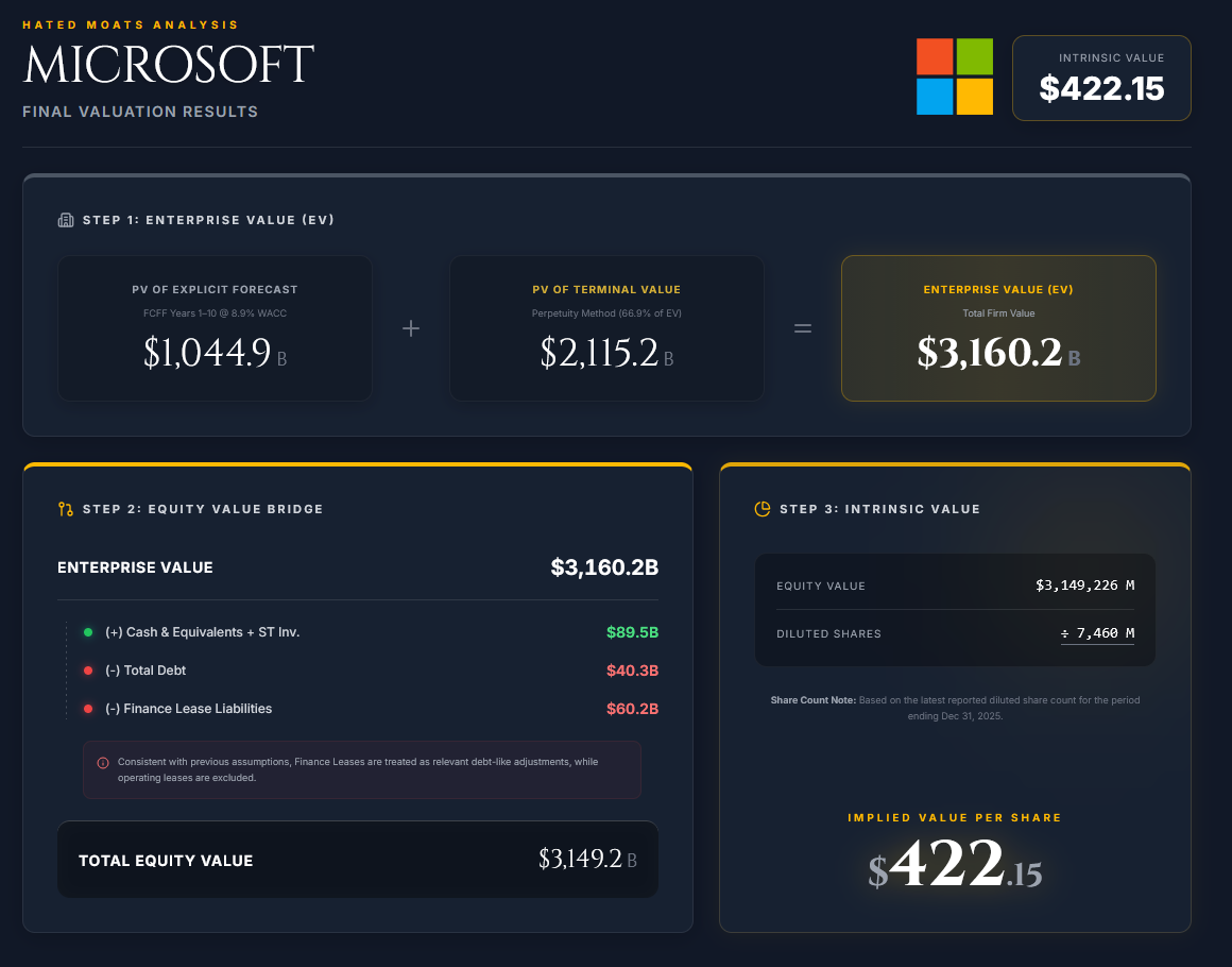 At $374.33 per share on 8 April 2026 and 7,429 million shares outstanding, Microsoft’s equity value was about $2.78 trillion. Gross interest-bearing debt at 31 December 2025 was about $40.3B, comprising current portion of long-term debt and generally long-term debt. Microsoft also disclosed material finance lease liabilities in the lease footnote. Using only funded debt implies a capital structure of roughly 98.6% equity and 1.4% debt, while including finance lease liabilities as debt-like financing implies roughly 96.5% equity and 3.5% debt. Because Microsoft is overwhelmingly equity financed, either treatment leads to effectively the same rounded WACC. For consistency with the reinvestment section, we use the latter, broader debt-like view that includes finance leases: