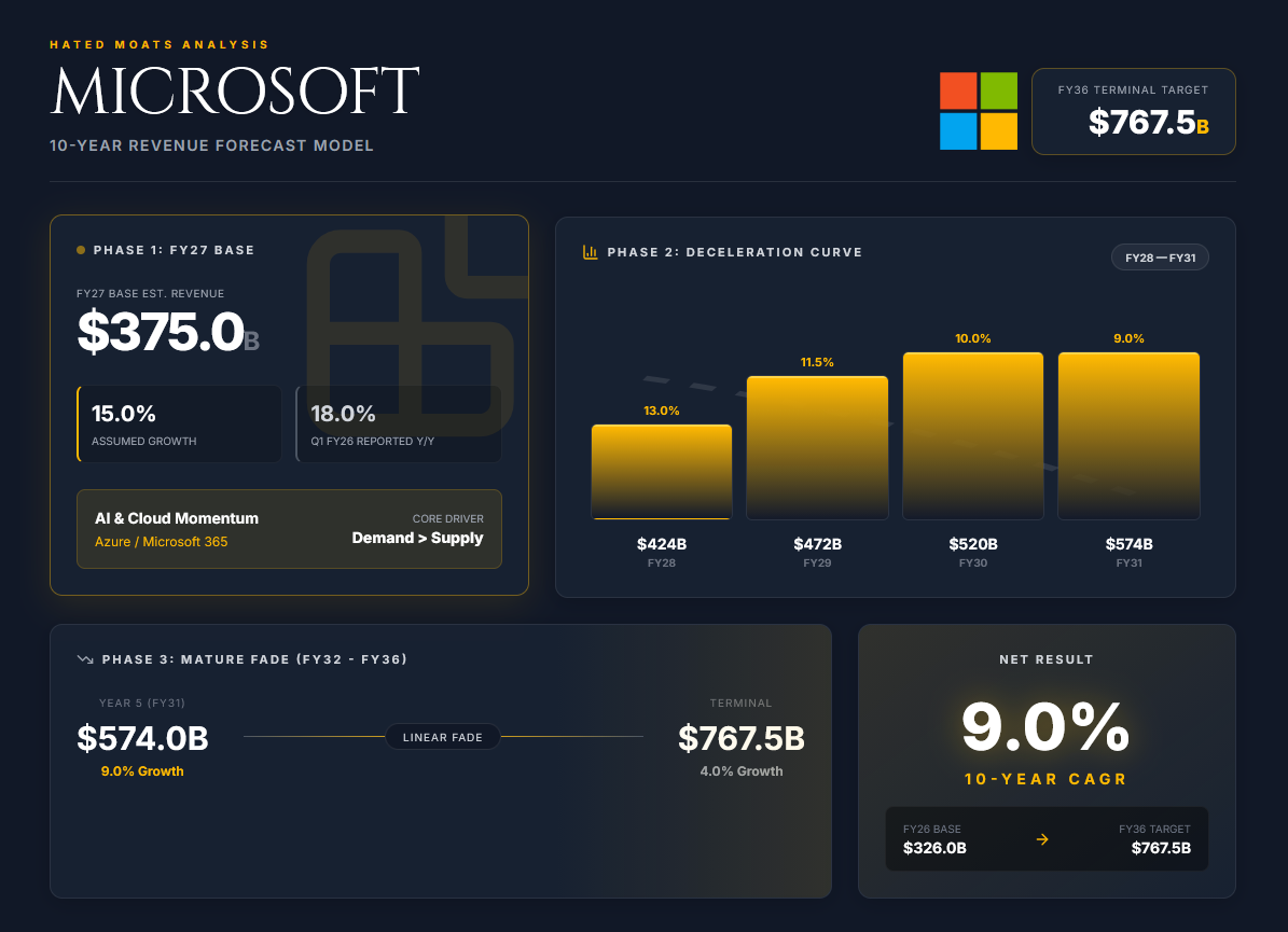In the outer forecast period, we fade growth linearly to 4.0% by FY2036. We assume this is acceptable as an exit-year growth assumption within the explicit forecast horizon, but it should not be conflated with the perpetual terminal growth rate thereafter (more on that below). Framed this way, our assumption recognises Microsoft’s scale, recurring revenue base, pricing power, and ability to monetise successive software and AI cycles, while still acknowledging that growth should converge meaningfully as the company matures further. On this basis, the implied 10-year revenue CAGR of about 9.0% and FY2036 revenue of roughly $765B - $770B are arithmetically consistent according to our calculations.