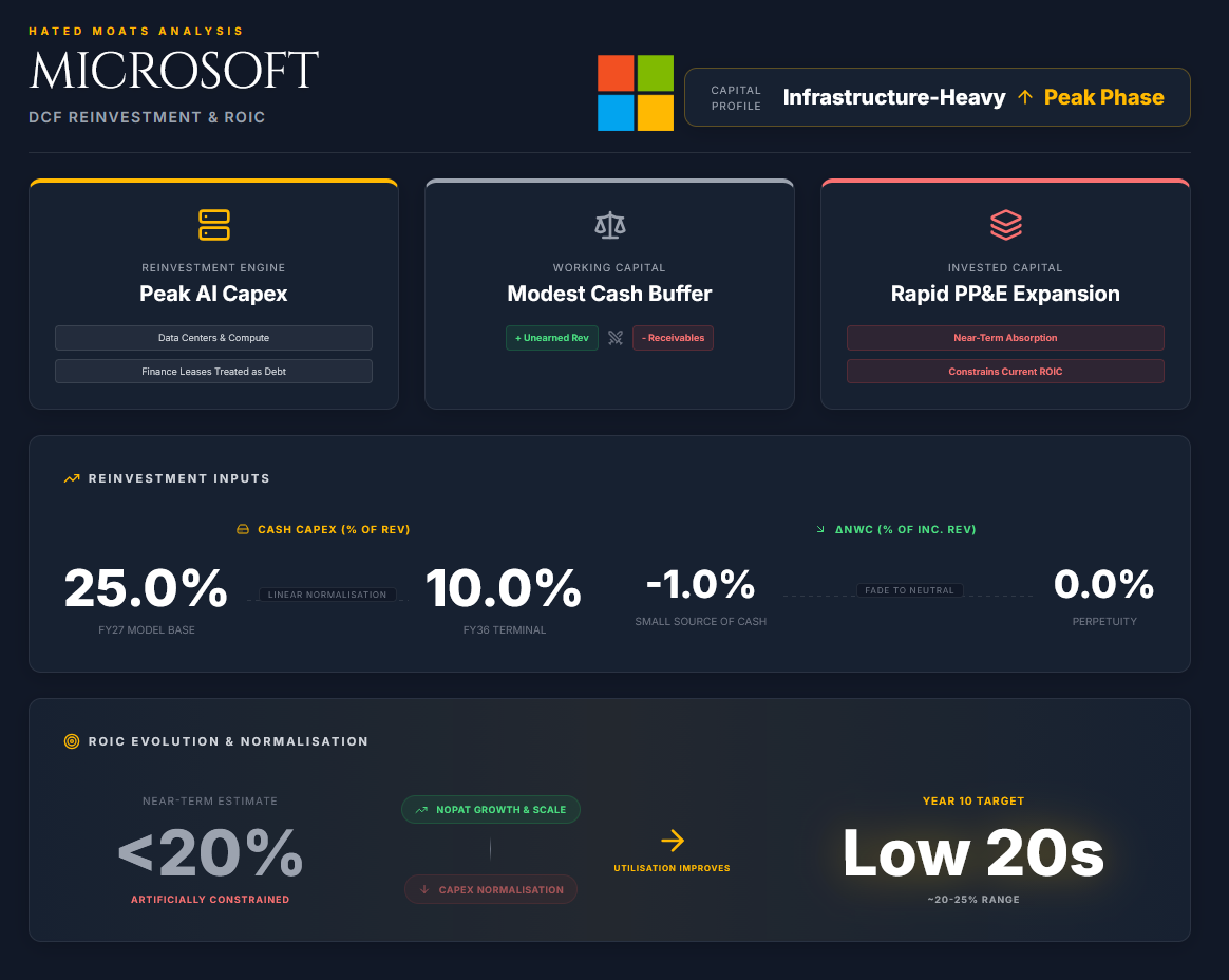 For NOPAT, the relevant assumption is a normalised operating tax rate rather than a cash tax rate. Microsoft’s effective tax rate was 17.6% in FY2025, while the reported rate for the first half of FY2026 was approximately 19.8%. Management’s tax guidance around that period was also about 19% on an adjusted basis. We thus apply a 20.0% tax rate to EBIT throughout the explicit forecast period. This is slightly above the recent run-rate, but we believe it avoids mixing cash tax assumptions with an accrual-based NOPAT framework, and it’s conservative without becoming unnecessarily punitive.