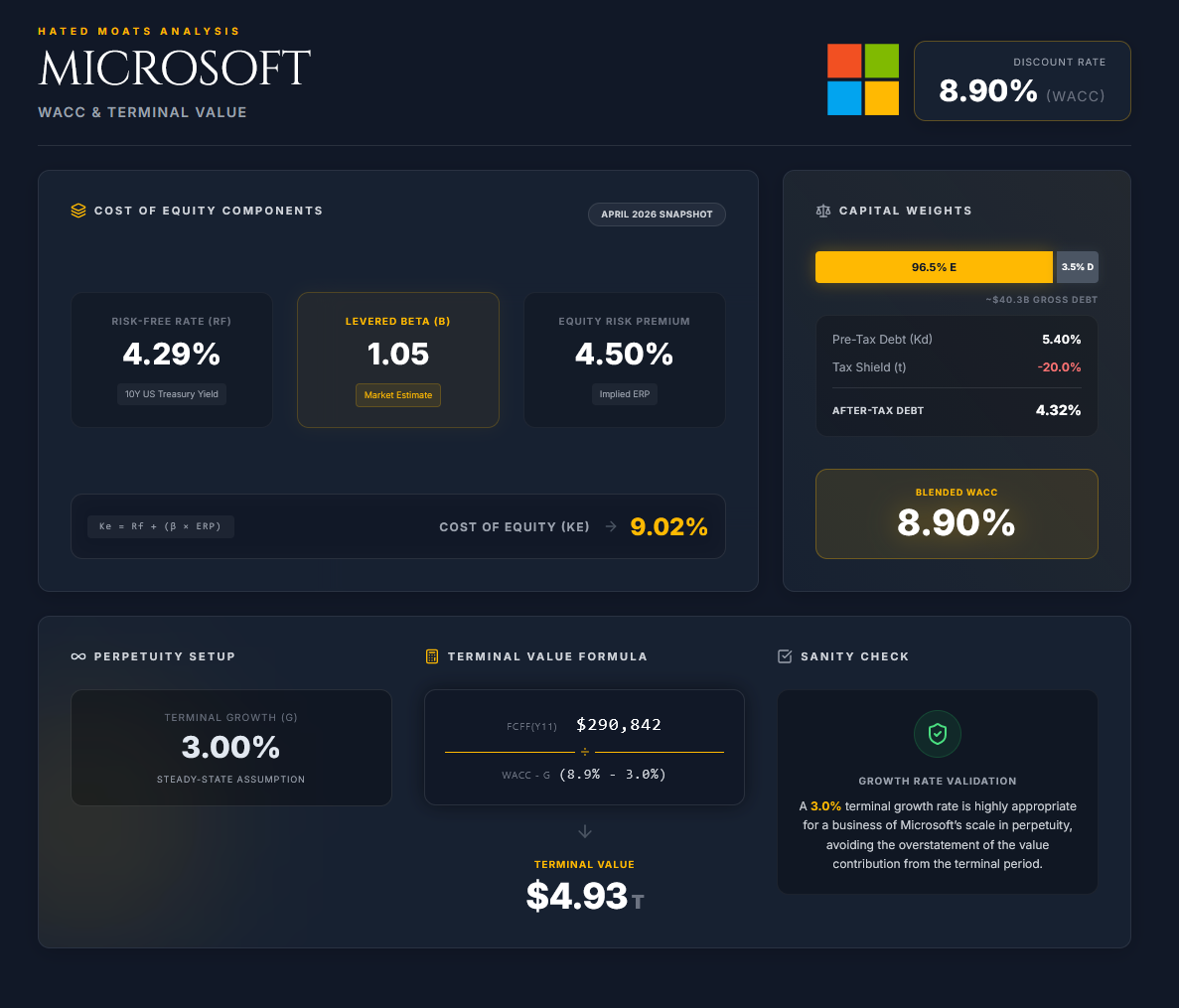 Microsoft continues to carry top-tier credit ratings, including Aaa from Moody’s, so using the 8 April 2026 Moody’s Aaa spread of 1.11% over the 10-year Treasury is a reasonable market-based proxy. We assume that combined with the 4.29% Treasury yield, this implies a pre-tax cost of debt of 5.40%, as showed above.