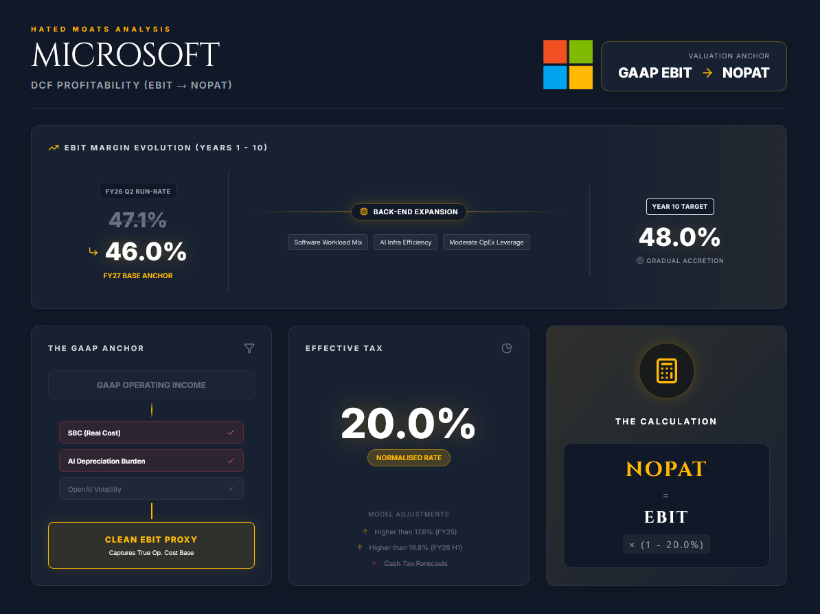 We use GAAP operating income as our EBIT proxy. For the case of Microsoft, this is not a case of translating an adjusted operating profit into GAAP EBIT. In FY2026 Q2, the non-GAAP adjustment disclosed by management related to gains and losses on OpenAI investments below operating income, rather than to operating income itself. Using GAAP operating income therefore captures the operating cost base, including stock-based compensation (SBC) and the depreciation burden associated with AI infrastructure, while excluding non-operating investment volatility.