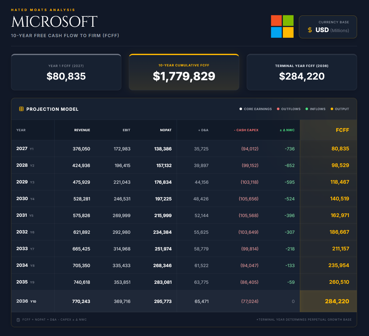 Likewise, oure projected path to more than $280B of annual FCFF should be treated as a long-range model output for FY2036 rather than as present economic evidence.