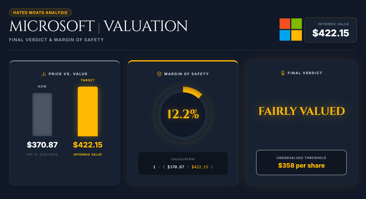 An 12.2% margin of safety doesn’t meet our threshold for an undervalued classification, where undervalued requires at least 15%. The conclusion is therefore that Microsoft is fairly valued, closed to being modestly undervalued rather than deeply mispriced.