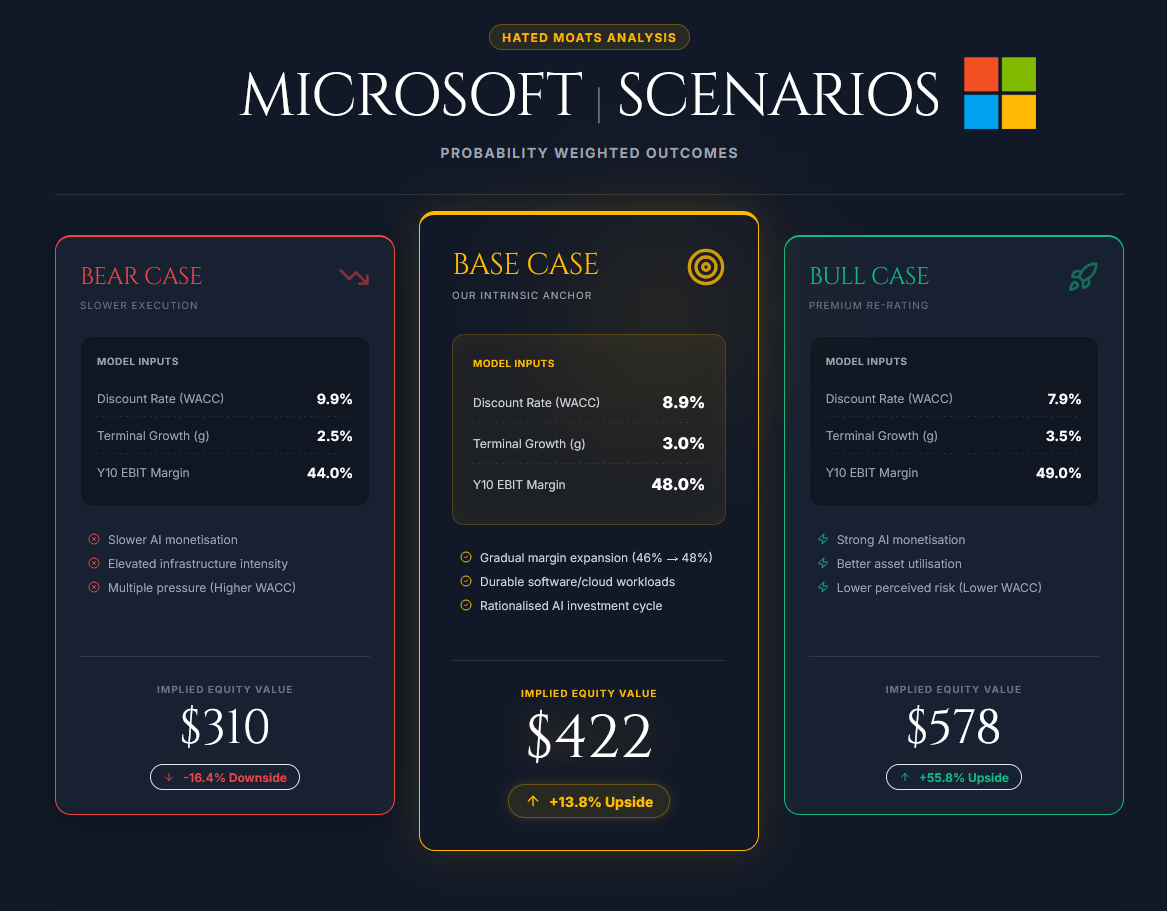 In other words, Microsoft still screens as an exceptional business, but not as a clear bargain. We believe that the more objective conclusion is that Microsoft is a high-quality compounder trading around fair value, with upside dependent on better-than-modelled AI monetisation, faster capex normalisation, or a lower sustained cost of capital.