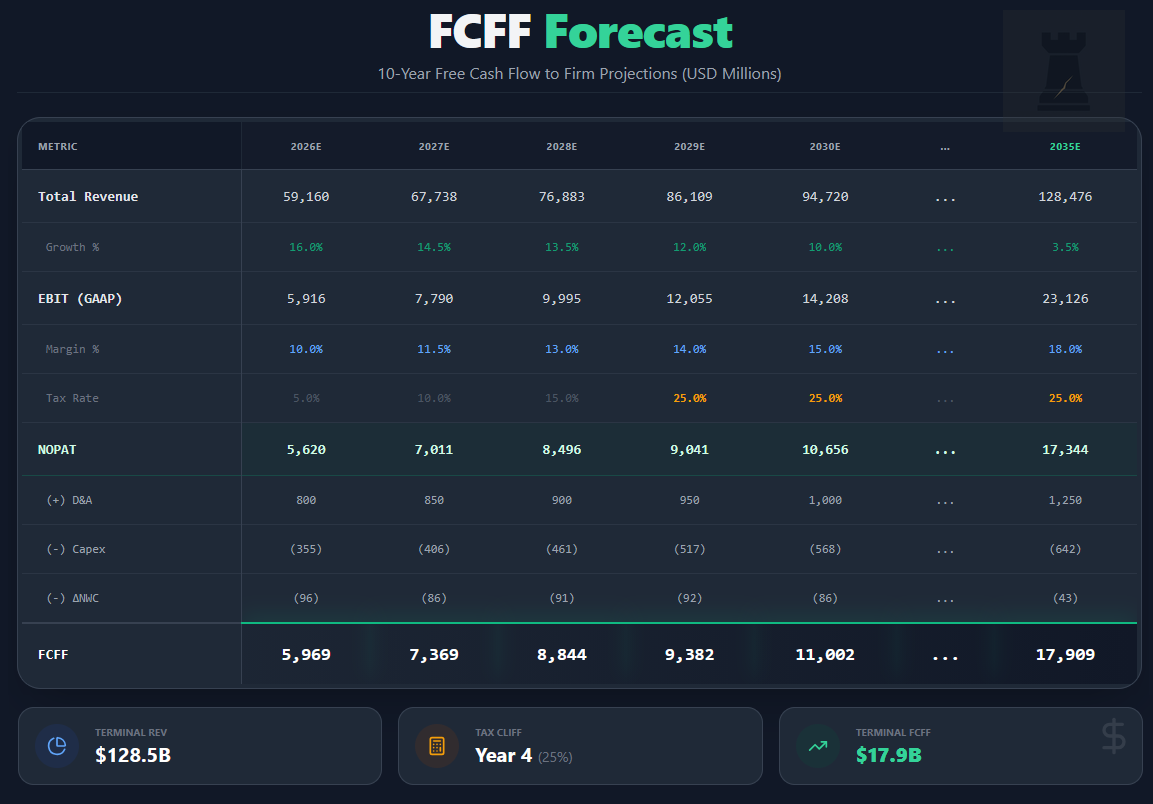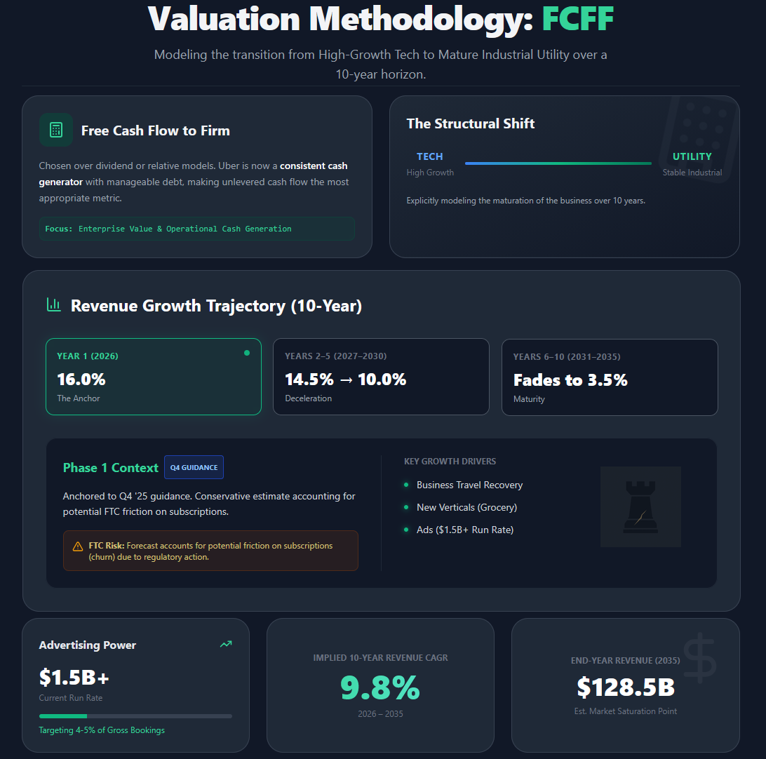 The valuation framework we used here is a Free Cash Flow to the Firm (FCFF) model. This approach is chosen over dividend discount or relative valuation models because Uber is now a consistent cash generator with a capital structure that includes manageable debt, making the unlevered cash flow view the most appropriate for assessing enterprise value. We explicitly model the transition from a high-growth technology company to a mature industrial utility over a 10-year horizon.