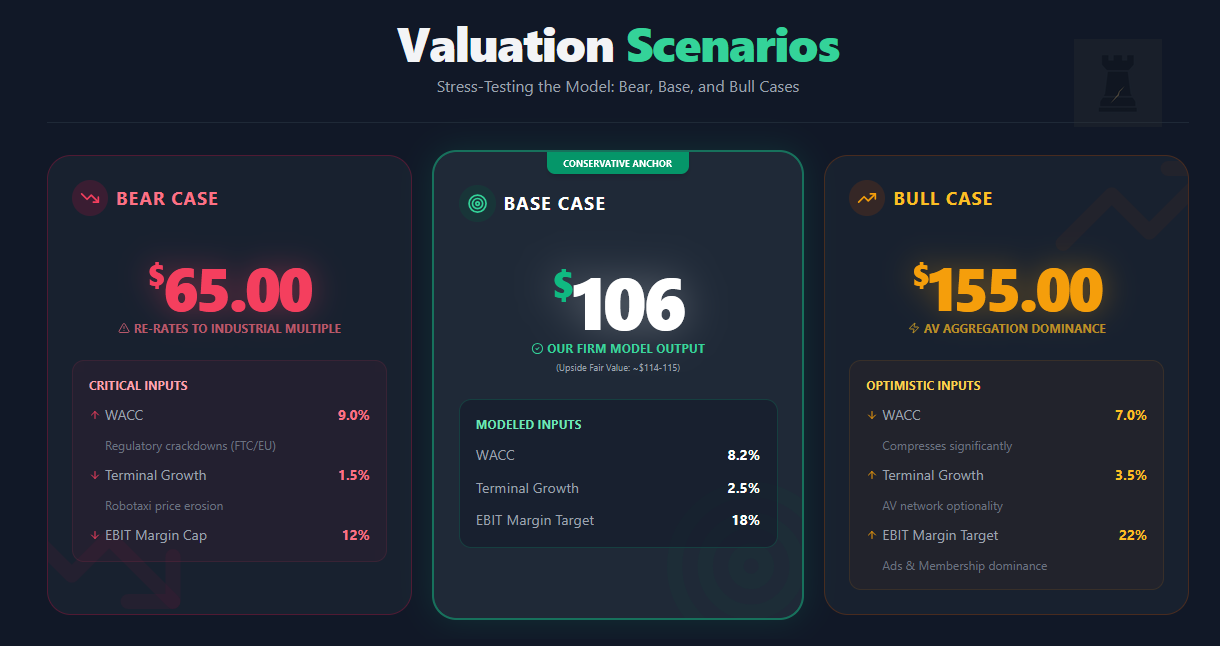 Inputs: WACC rises to 9.0% due to regulatory crackdowns (FTC fines, EU reclassification). Terminal growth falls to 1.5% as Robotaxis (Tesla/Waymo) erode pricing power. EBIT margins cap at 12%.