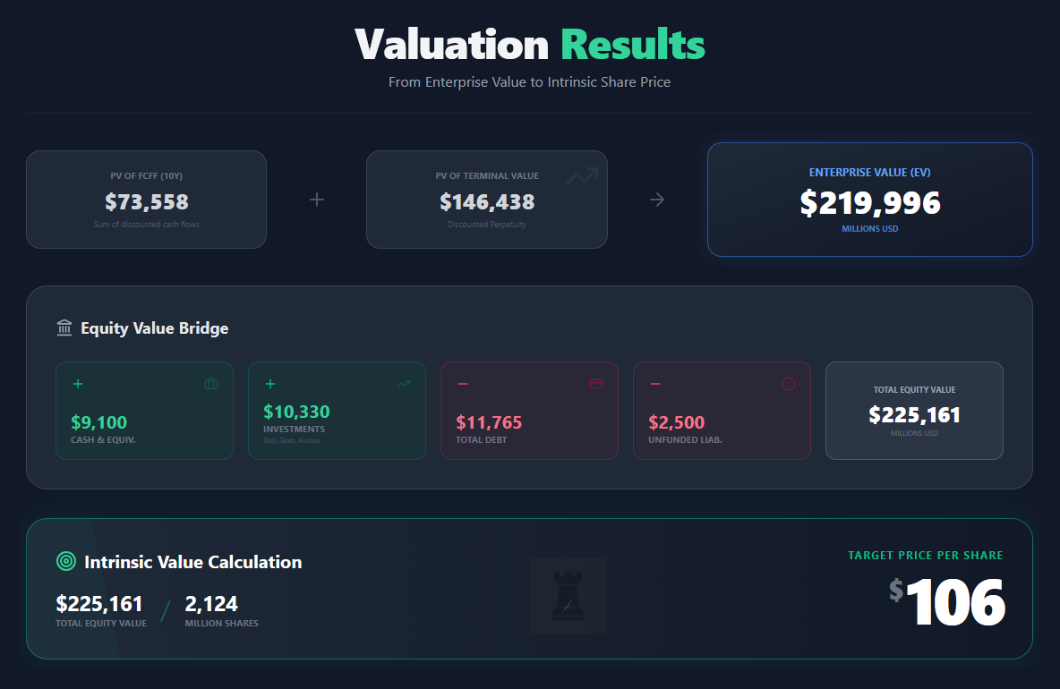 In this terminal phase, the growth rate fades linearly to 3.5% in the terminal year (2035). This rate is slightly above long-term nominal GDP forecasts (typically 2-3%), reflecting Uber’s pricing power as a utility and continued population growth in urban centers. It assumes the rideshare market has reached saturation in developed nations.