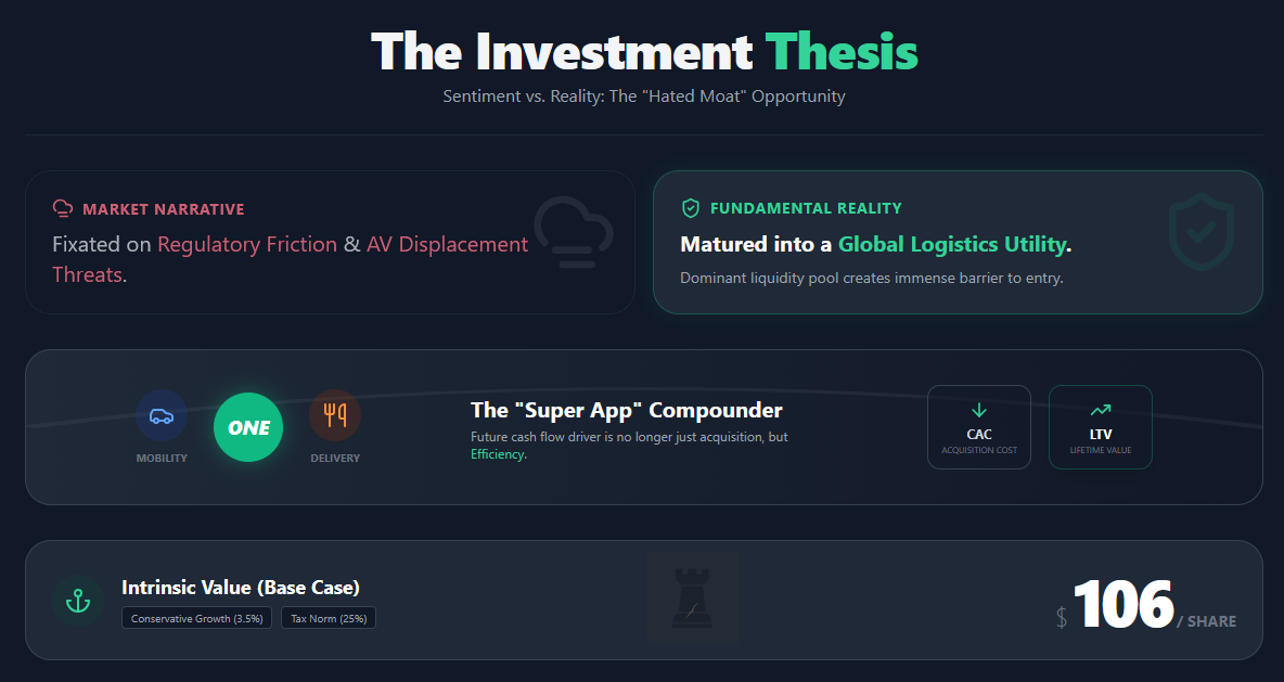 Furthermore, the “regulatory overhang” from the FTC lawsuit regarding subscription cancellations is a headline risk that creates a temporary depression in the multiple, but does not fundamentally break the network effect. With a margin of safety approaching 25% and a clear path to $10B+ in annual Free Cash Flow, Uber offers asymmetric upside for investors willing to look past the “hated” headlines.