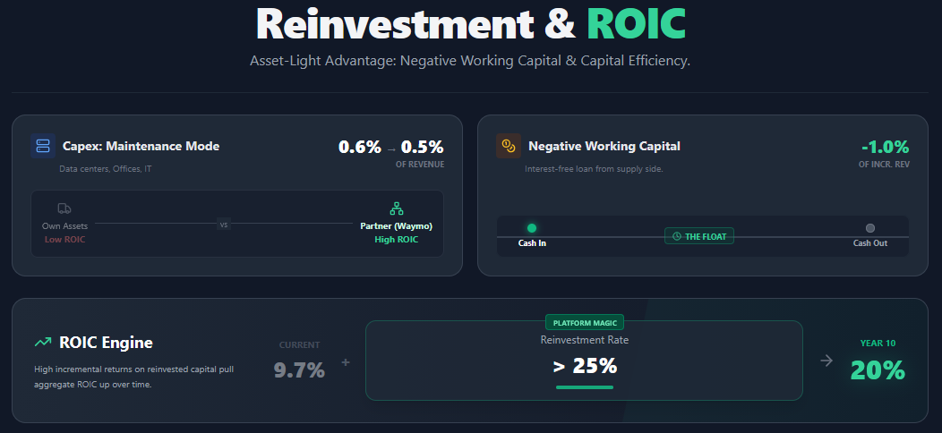 Even in an autonomous future, we assume Uber maintains a “hybrid network” approach where it partners with fleet operators (like Waymo) rather than owning the metal assets on its balance sheet. This preserves the ROIC profile.