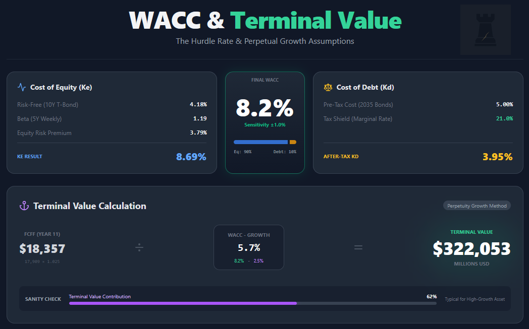 Sanity Check: The Terminal Value represents approximately 62% of the total Enterprise Value, which is typical for a high-duration asset with significant growth remaining in the explicit forecast period.
