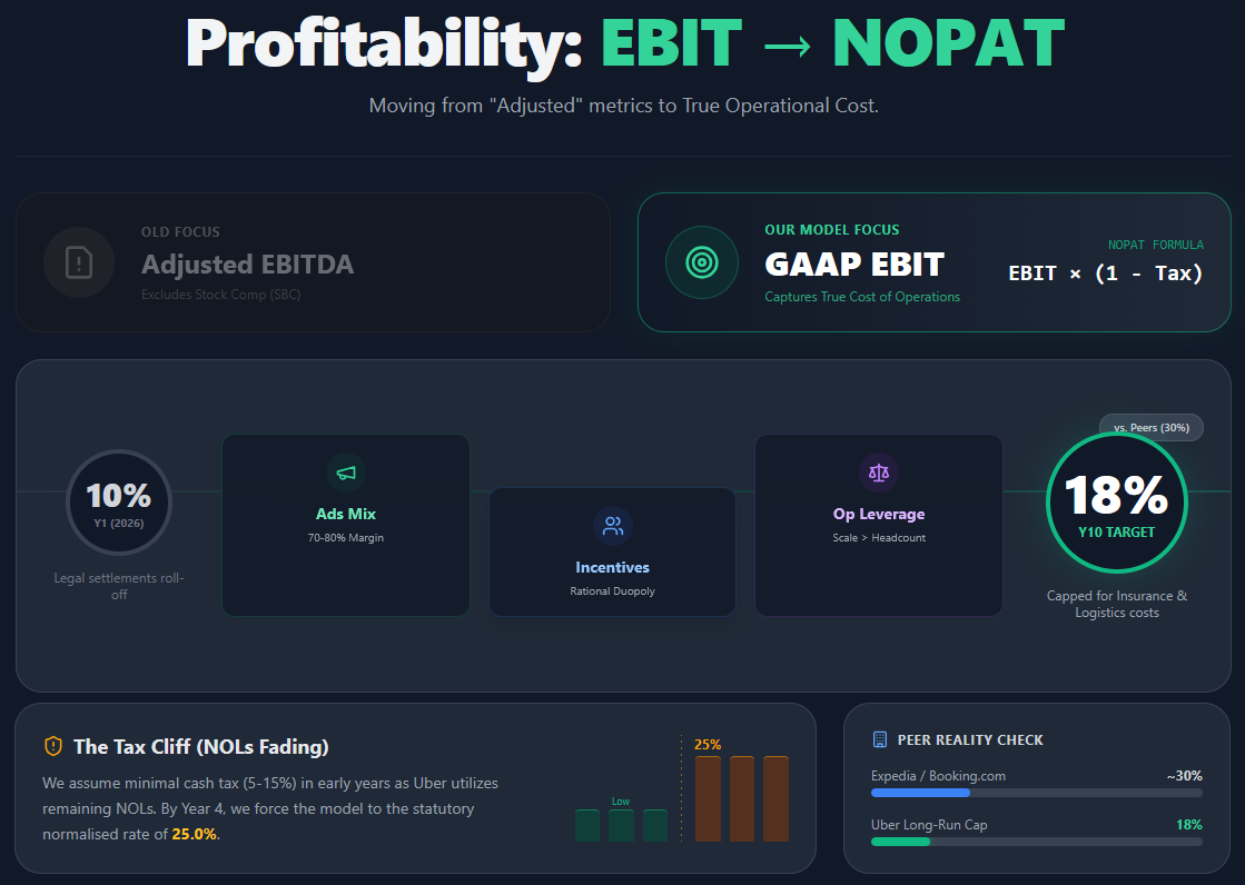 We assume Uber pays a minimal cash tax rate (5-15%) for Years 1-3 as it utilises remaining NOLs. By Year 4 (2029), we force the tax rate to the statutory normalised rate of 25.0% (blended US federal/state and international). This creates a “tax cliff” in the FCF forecast that provides a realistic drag on value while still remaining comfortably conservative.
