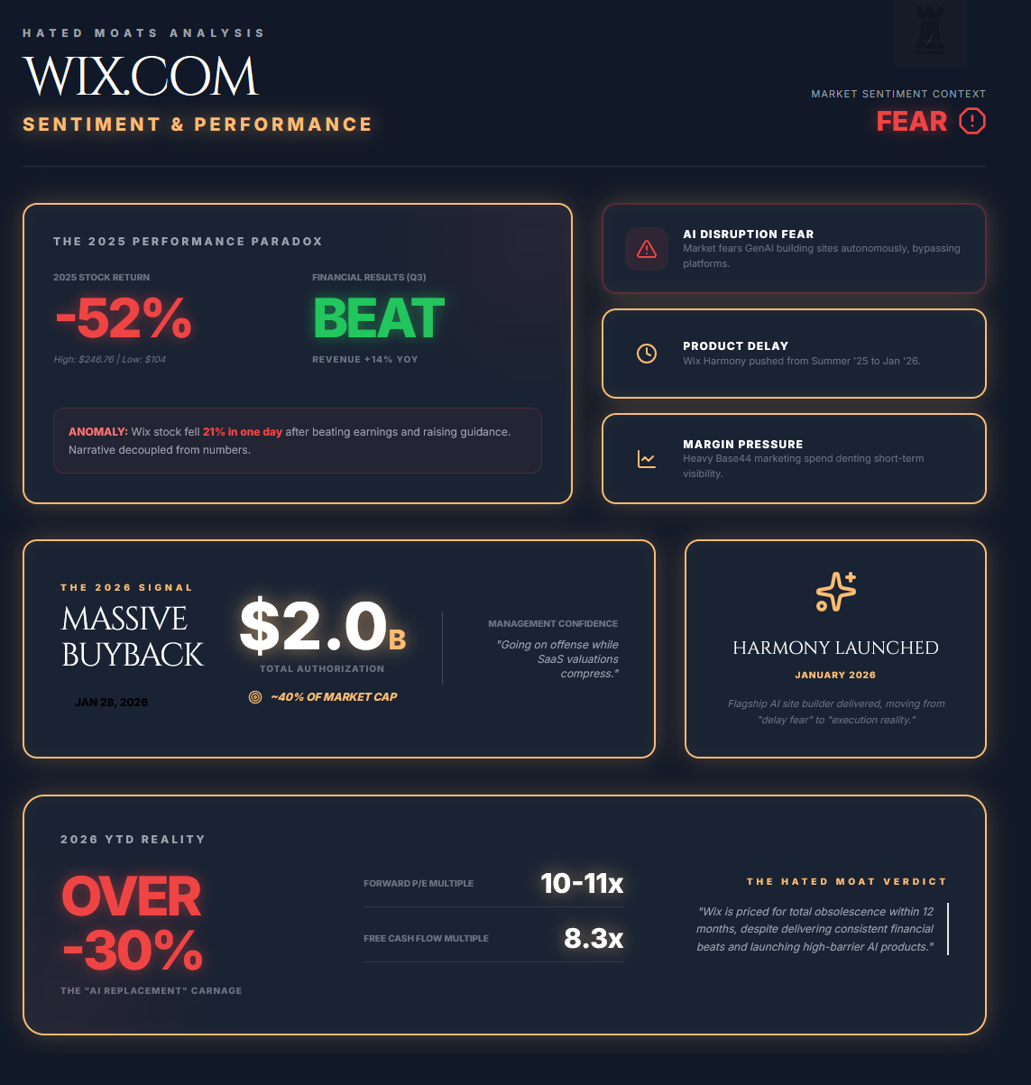 Yes, we did. The market’s reaction underscores extremely negative sentiment overshadowing fundamentals. Investors fixated on two issues: One, near-term margin pressure from AI investments (and fears of AI being the disruptor on its onw), and two, delays in a flagship product launch. In Q3, Wix’s new AI-driven coding tool (Base44) was growing rapidly, but heavy marketing spend on it dented operating margins. Management also shifted more customers to monthly subscriptions (away from multi-year prepaids), which, while potentially boosting long-term value, hurt short-term visibility and worried investors about revenue predictability. Additionally, the CEO admitted a highly anticipated new product (the AI-powered Wix Harmony site builder) had to be postponed, saying he was “clearly unhappy” about delaying a flagship product from summer 2025 to 2026. This fed a narrative that Wix’s growth drivers were slipping, just as the market was looking for acceleration. The result was a rush for the exits. By November 2025, WIX was down roughly 50% YTD and trading at 14x forward earnings and 10x FCF, i.e. levels indicating scepticism about its growth and its moat.