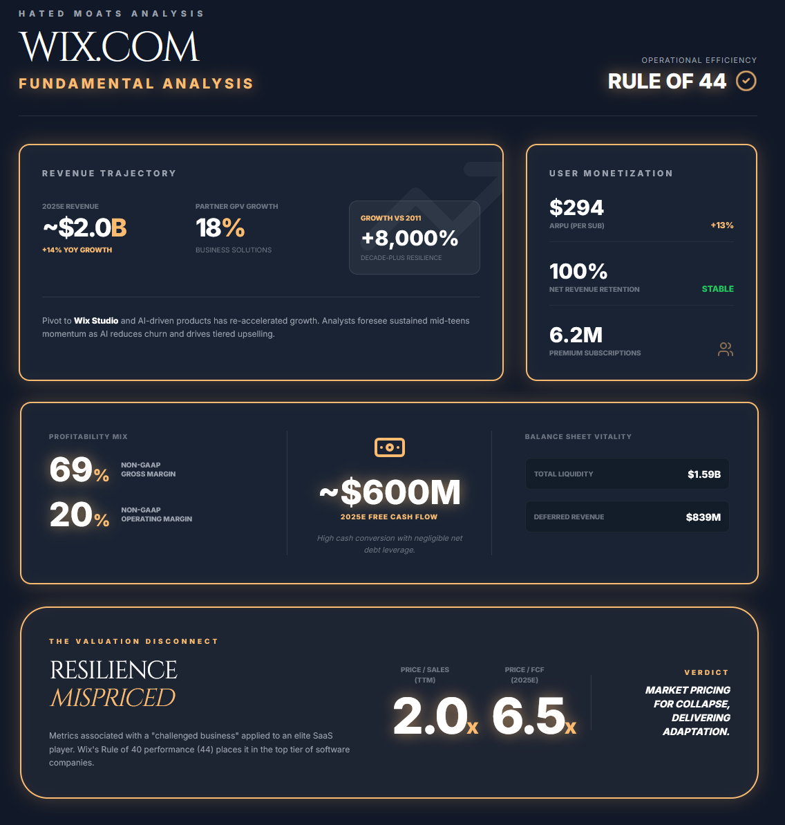 These are metrics you’d associate with a no-growth and challenged business, not one growing double-digits with a competitive moat. By contrast, Wix’s Rule of 40 performance (14% growth + 30% FCF margin = 44) is among the elite class of SaaS companies, illustrating that it’s both growing and efficiently managed. One could argue the market is “pricing in” a collapse in Wix’s business (more on that fear in Risks), but current fundamentals do not show such a collapse. Contrary to that, they show resilience and adaptation.