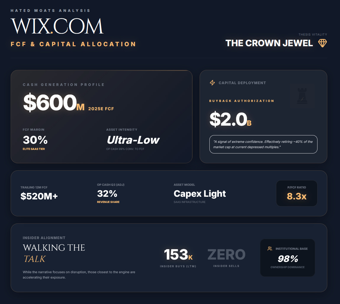 In sum, Wix’s fundamentals are objectively robust. Mid-teens growth, improving quality of earnings (GAAP near profitability, strong FCF), and a shareholder-aligned management returning capital. Key financial ratios underscore how undervalued the stock appears: As of mid Febuary, 2026, WIX is ~$70-71 with market cap of ~$3.87B. Using TTM revenue of ~$1.93B, P/S is ~2.0. Using Wix’s 2025 free cash flow guidance of ~$600M, P/FCF is ~6.5.