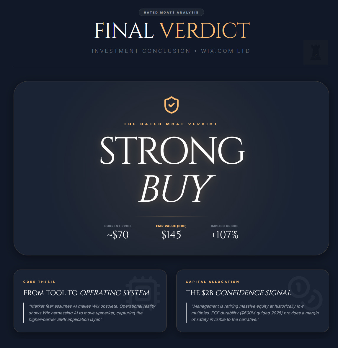 To close this one up, Wix.com exhibits the hallmark of a “hated moat” situation. A solid (even widening) moat that the market hates for transitory or speculative reasons. This disconnect is our opportunity. With a professional management team, improving financial metrics, and a clear commitment to innovation, Wix appears positioned not just to survive the AI era but to harness it. Investors who can look past the doom-and-gloom headlines and focus on fundamentals may find Wix to be an unexpected winner in the coming years. We would not be surprised to see sentiment do a 180 turn. Today’s pessimism can turn into tomorrow’s optimism once results speak for themselves, and all we’ll see will be “it was so obvious” and “we all knew this was gonna happen” as a new general consensus. Hence, we confidently label WIX as a Strong Buy, expecting substantial alpha over the mid to long term. The stock is down, but far from out. In our analysis, the downside scenarios are well overshadowed by the upside potential of this hated moat.