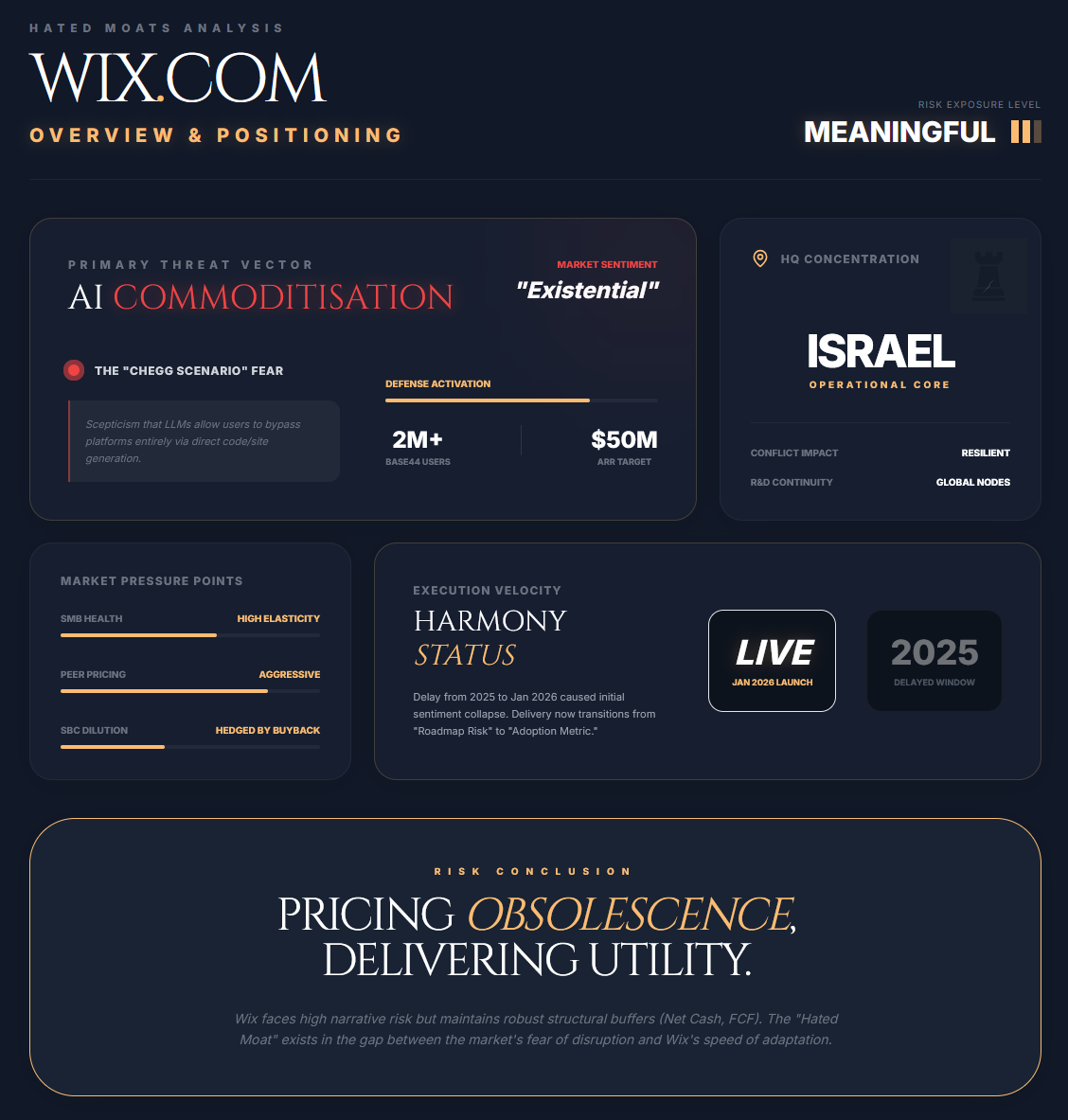 Notably, macro and sector sentiment likely contributed to volatility, but we attribute the sell-off primarily to company-specific concerns cited around Q3 (AI spend/margins and the Harmony delay). Short interest in WIX stock climbed (recently 10-12% of float is short), reflecting traders betting on further declines or hedging. Among the retail investors, sentiment also soured, often echoing the “AI threat” theme, questioning if Wix could survive the rise of generative AI that might build websites autonomously. This dichotomy (strong results vs. fearful narrative) defines the stock’s recent story, and potentially presents an opportunity for Hated Moats.