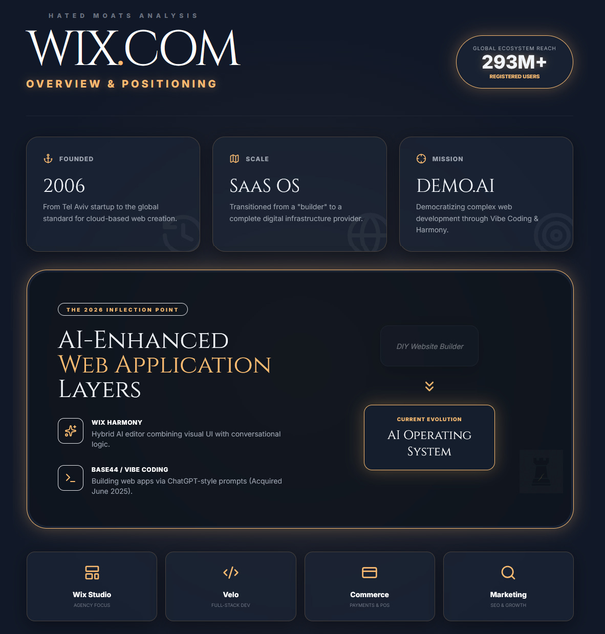 Wix.com Ltd ( WIX 0.00%↑ ) is a leading global SaaS platform for creating and managing websites and online services, catering primarily to individuals, small businesses, and increasingly agencies and enterprises. Founded in 2006 in Tel Aviv, Wix has evolved from a do-it-yourself website builder into a comprehensive “operating system” for online presence. Its offerings include Wix Editor and Wix Studio (design platforms), e-commerce and payment solutions, marketing and SEO tools, a third-party App Market, and new AI-driven products like Wix Harmony (Wix’s flagship AI website builder / hybrid editor combining vibe coding with visual editing). This breadth positions Wix as a one-stop solution for users to design, host, and grow their digital presence without deep technical skills. The company’s mission of “democratising web development” remains central, now extended to AI. Its Base44 (June 2025) acquisition brings natural-language “vibe coding” capabilities, aiming to let users build web applications through ChatGPT-style prompts. With around 293 million registered users globally (and millions of paying subscribers), Wix entered 2026 at an inflection point, i.e. transitioning from a pure website builder to an AI-enhanced web creation platform.