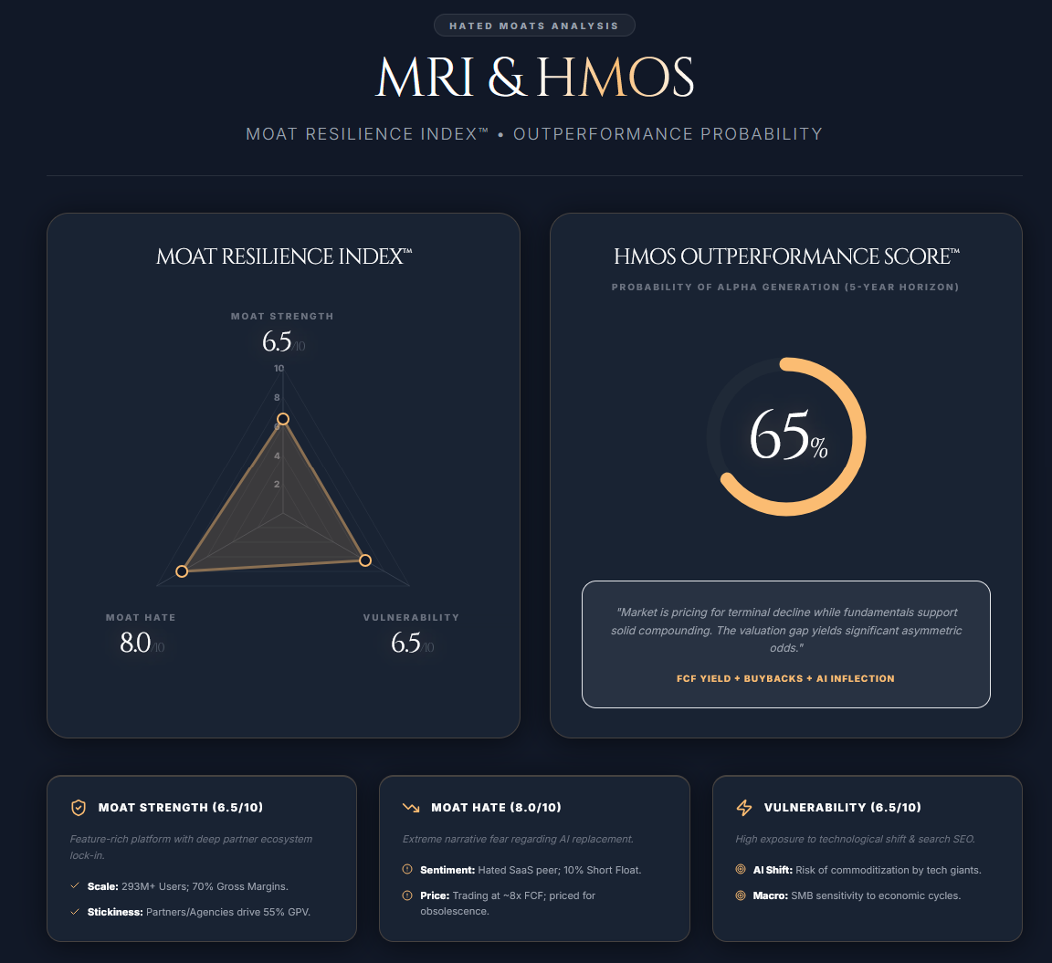 This measures how disliked the company is by the market - essentially, the contrarian appeal. Wix scores a 8 here, indicating extreme pessimism has been priced in. The stock’s 2025 plunge (continued well into beginning of 2026) and 70% drop from its Jan 2025 peak show that investors have heavily discounted Wix over fears of AI disruption and slowing growth. Short interest is elevated (around 10% of float) and until very recently, sentiment on forums and headlines was very negative. When a fundamentally profitable, growing company trades at <10x cash flow and some analysts see 100% upside to targets, you know it’s hated in the market. This “moat hate” is actually a positive for contrarian investors who have enough conviction. It means expectations are low. We give it 8/10 because while sentiment has ticked up slightly with the buyback news, the “SaaS carnage of 2026” continues and Wix is still among the more disfavoured cloud/software stocks (many peers trade at far richer valuations). The high “hate” score implies potential for outsized gains if the narrative shifts.
