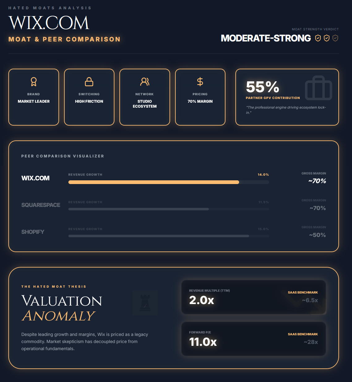 We assess Wix on our proprietary Moat Resilience Index™ (MRI), focusing on three dimensions – Moat Strength, Moat “Hate”, and Moat Vulnerability.