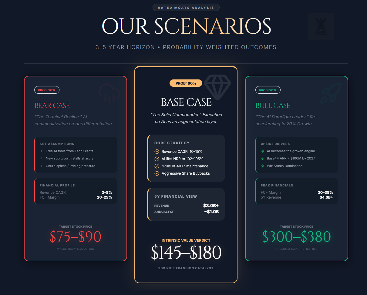 Revenue growth decelerates quickly and falls to low single digits here, roughly 3-5% annually, within a couple of years. FCF margins compress into the low 20% range as economies of scale are offset by higher marketing spend needed to retain users and defend share. With a slower growth and lower margin profile (around 4-5% growth paired with 20-25% free cash flow margins), intrinsic value drops meaningfully, a plausible downside is FCF falling to roughly $450-$600M with the market applying 10-14x FCF, which could justify a stock price in the $75-90 range. Over a 3-5 year period the stock could trade sideways or drift lower, underperforming the market, as FCF stagnates and the narrative shifts toward a vulnerable moat. Even so, the company would likely remain profitable and cash-generative, making this less an existential collapse than a “value trap” outcome. This is framed as a lower-probability scenario at about 20%, partly because Wix would still have strategic levers (such as moving upmarket or emphasising cost discipline and realising buybacks) to protect cash generation and value to shareholders even if growth weakens.